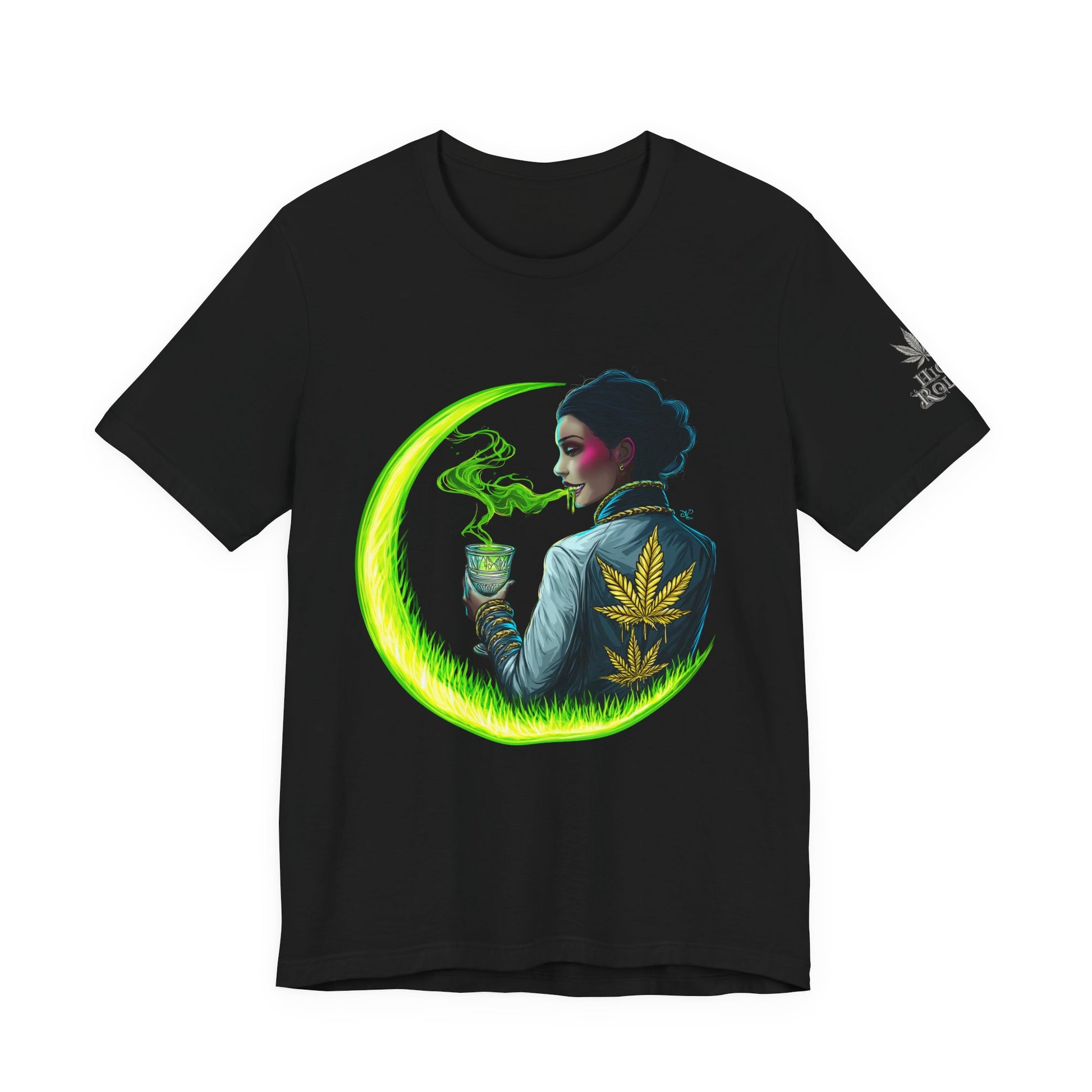 This majestic afrofuturistic masterpiece features a regal Black queen in military-inspired regalia, her natural afro crowning her like a halo while she exhales ethereal emerald smoke from a ceremonial cannabis vessel, all framed within a luminescent green crescent moon that transforms into a garden of premium plants. The commander's powder blue uniform jacket is adorned with golden cannabis leaf insignias on the back, signifying her rank in the elevated army of culture, while vibrant magenta accents highlight her profile like war paint for peaceful warriors. The composition creates a powerful statement of Black excellence in cannabis culture, with the subtle "420" sleeve marking identifying this as essential gear for those who understand that true HIGH ROLLERS recognize queens who command both respect and the finest cannabis experiences.
