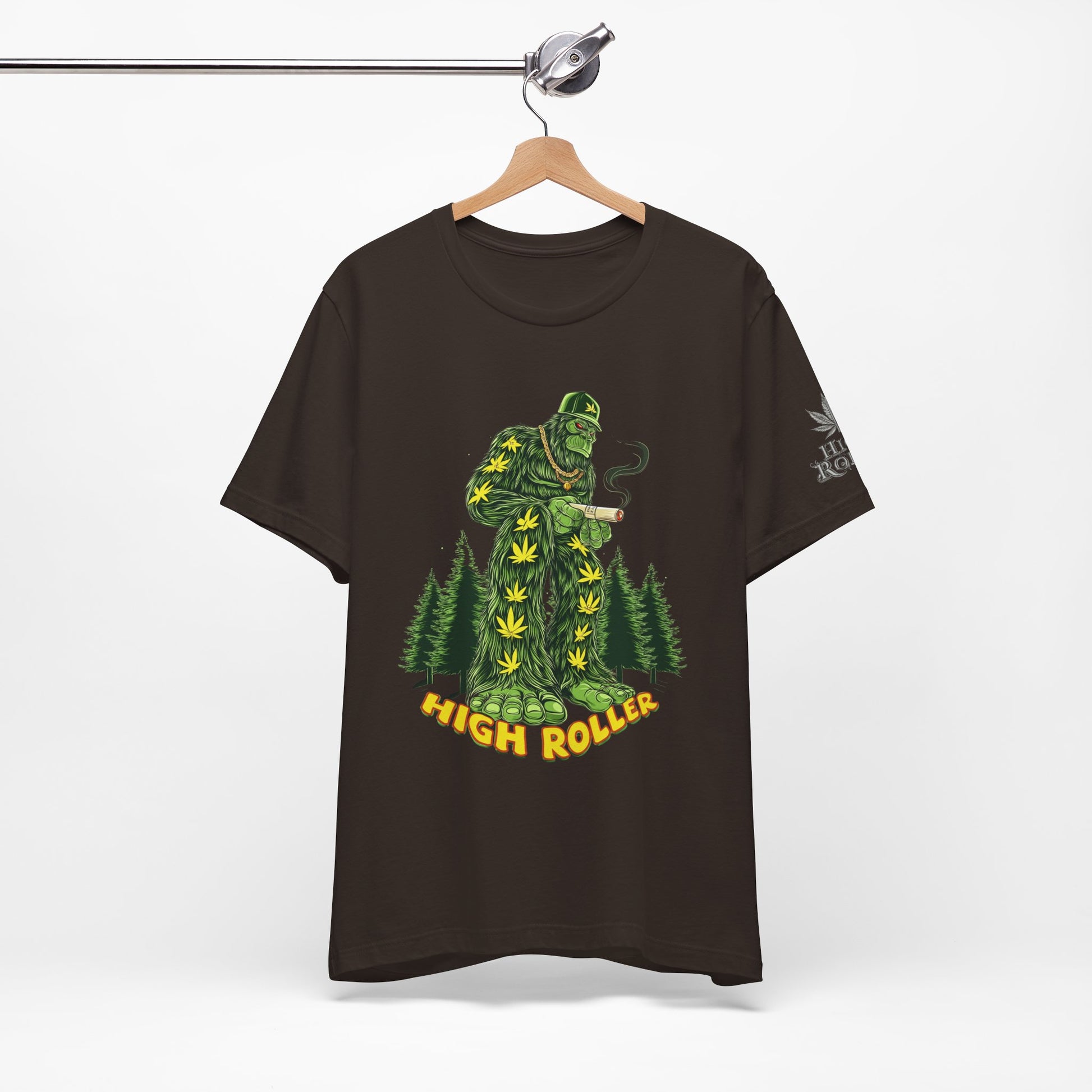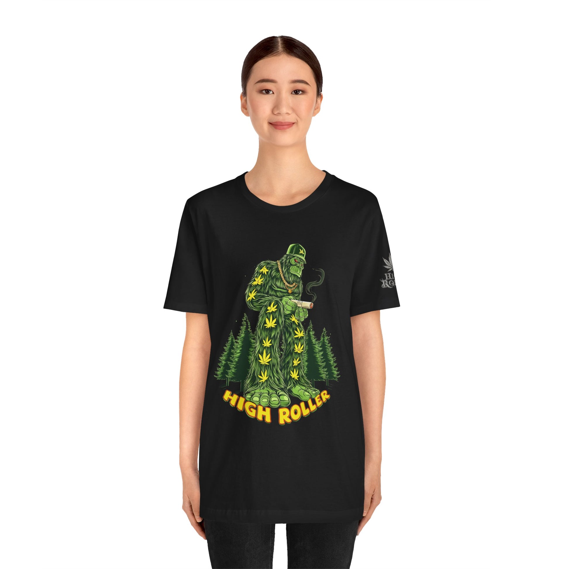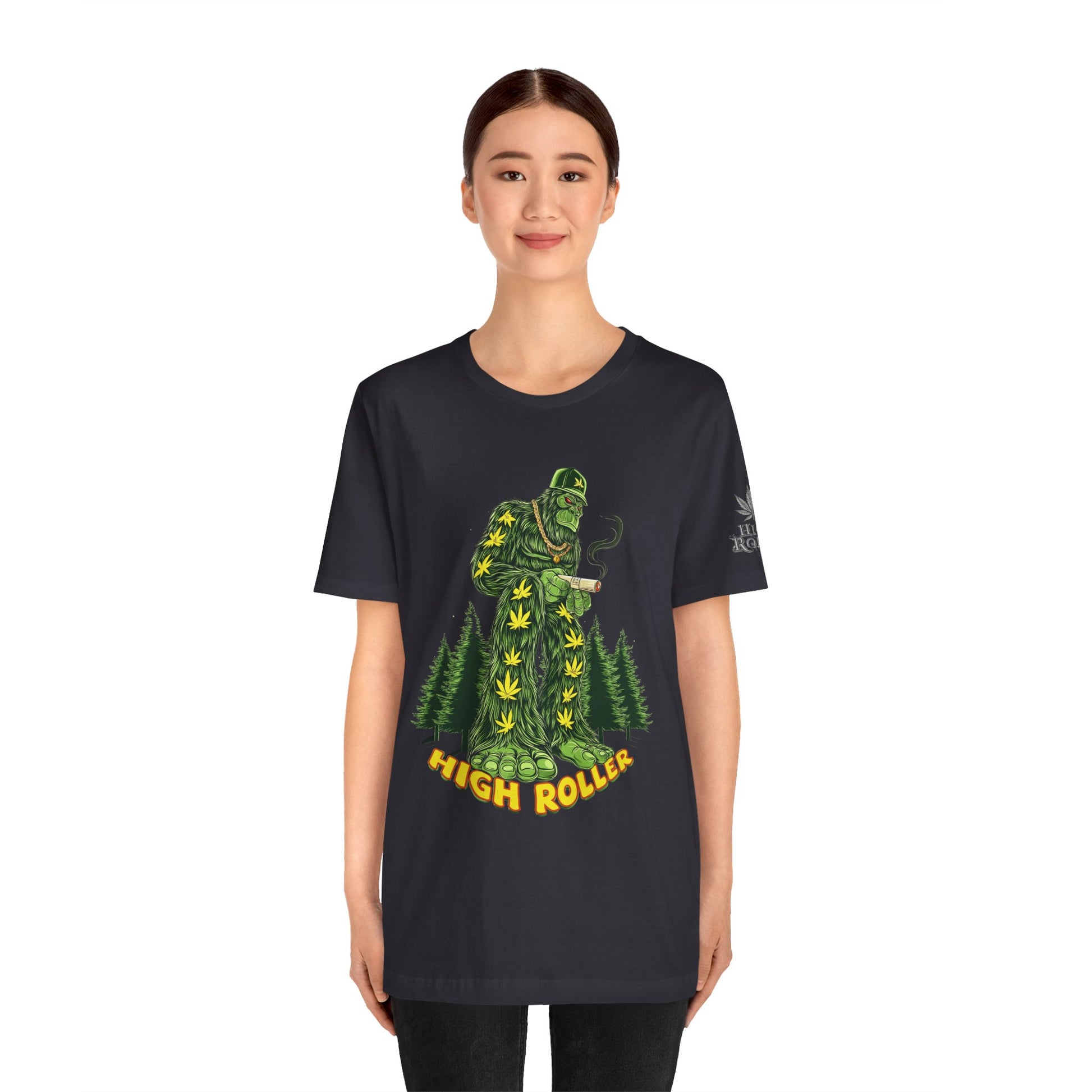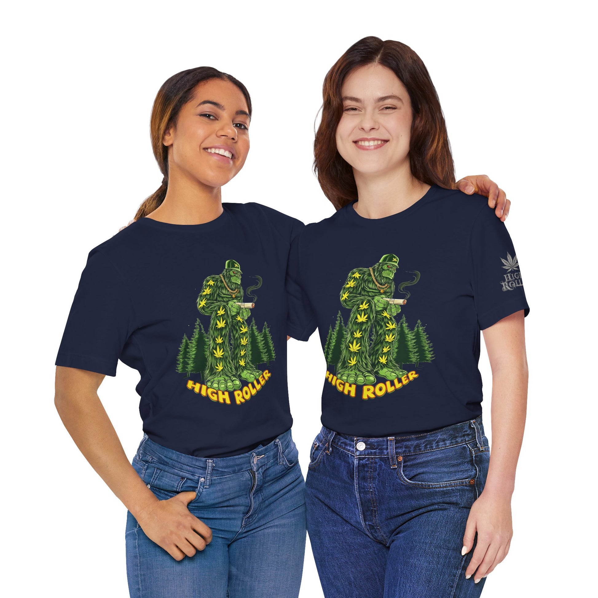 This legendary forest masterpiece features the ultimate cannabis cryptid—a majestic Bigfoot composed entirely of vibrant golden-green cannabis leaves, smoking a ceremonial pipe while standing guard over his evergreen domain, proving that some legends are rooted in more than just folklore. The mythical beast's entire form is crafted from perfectly rendered cannabis foliage that creates natural camouflage for the forest's most elusive HIGH ROLLER, while wisps of smoke curl from his pipe like morning mist through the pines. The composition is grounded by a forest of deep green evergreens and crowned with bold "HIGH ROLLER" lettering in golden yellow, with the subtle "420" sleeve marking identifying this as essential gear for those who understand that Bigfoot stays hidden not from fear but because he's protecting the forest's finest cultivation spots.