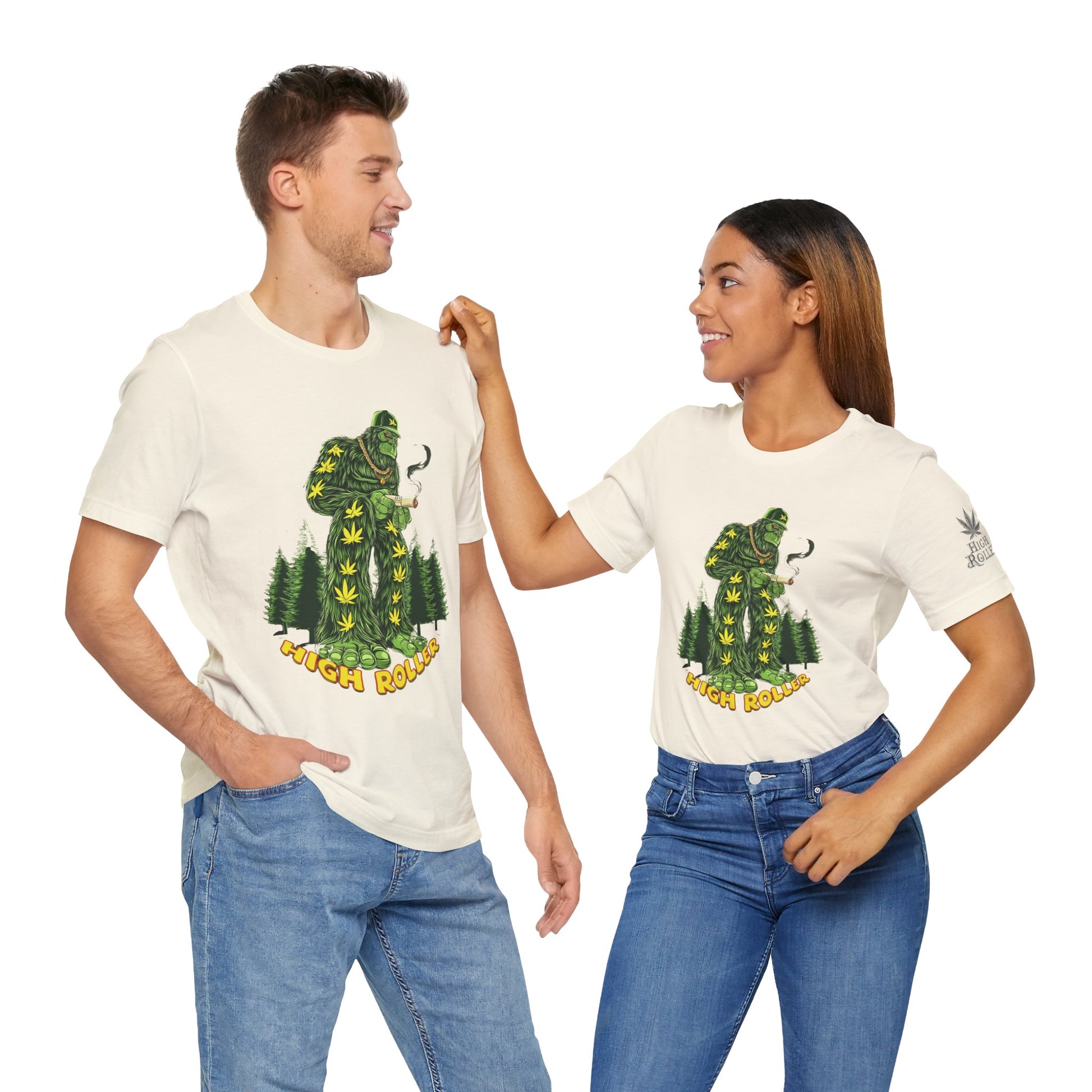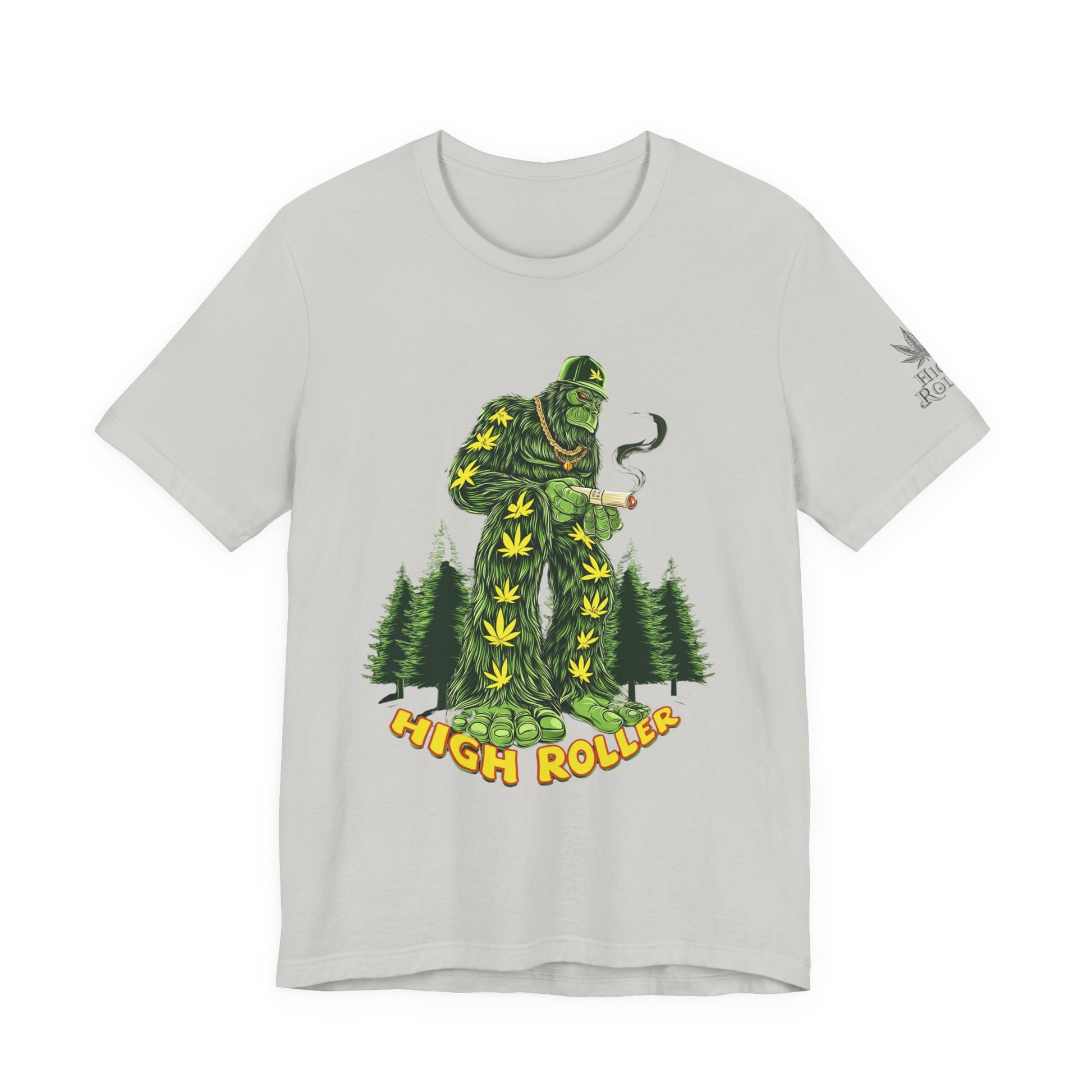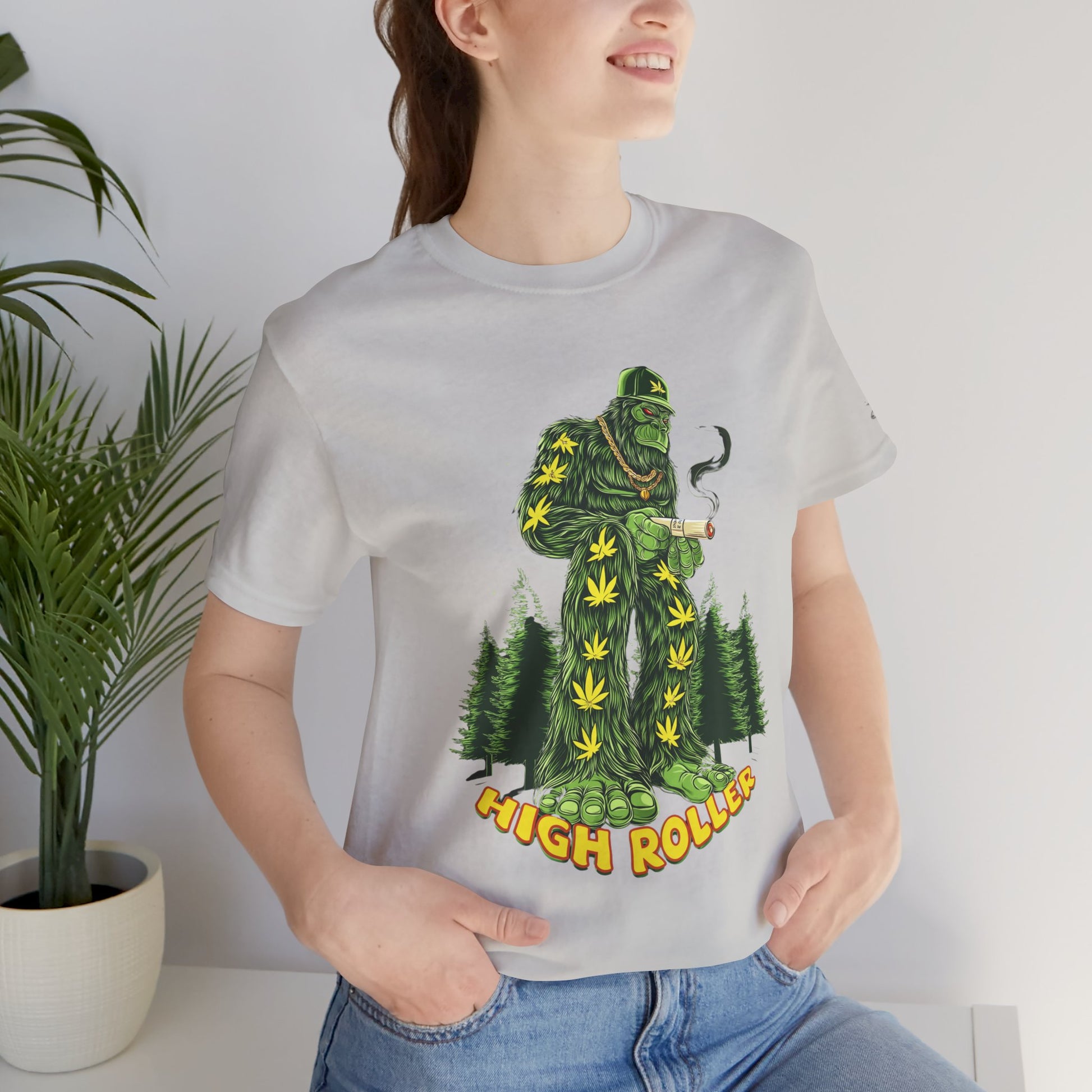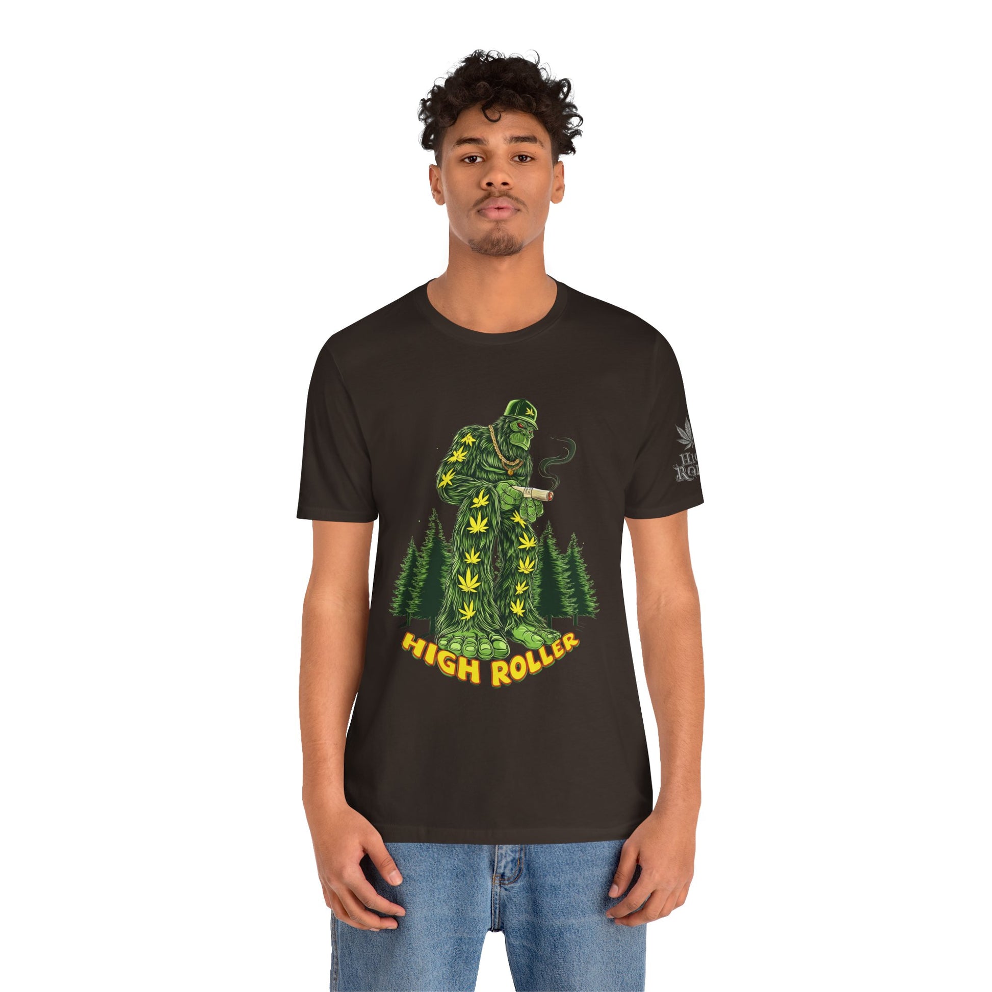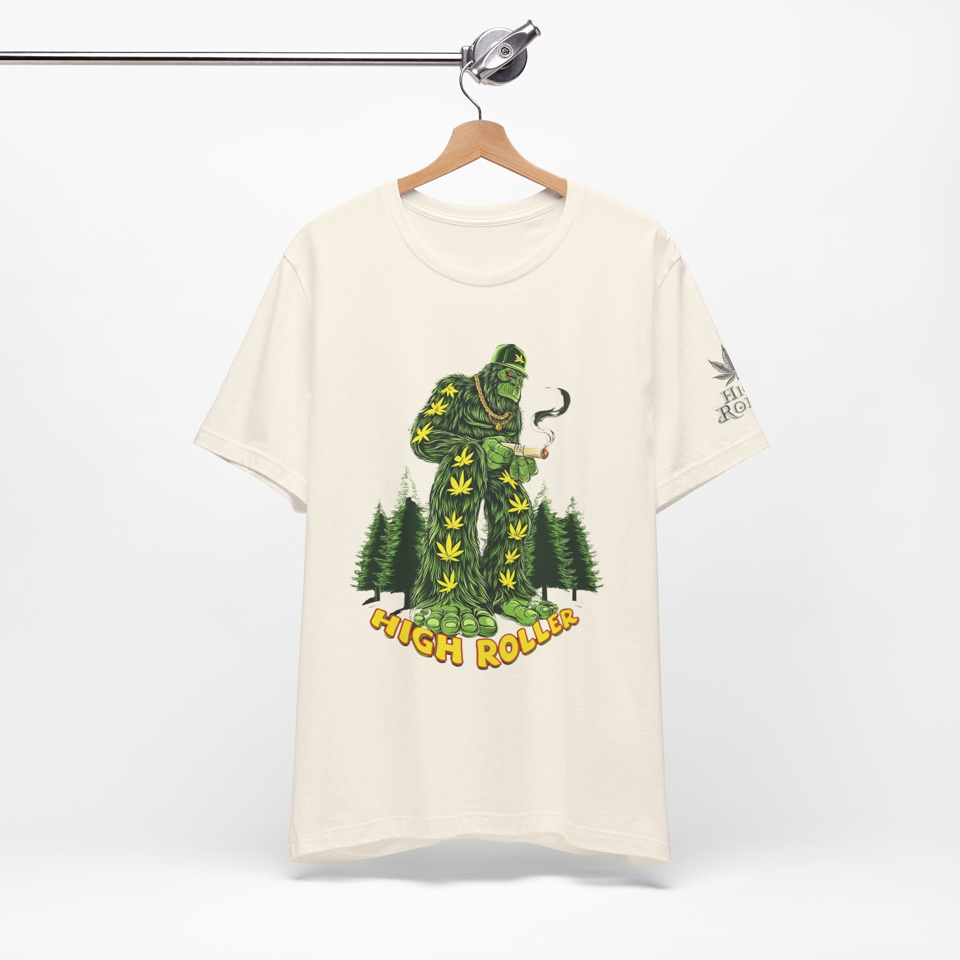 This legendary forest masterpiece features the ultimate cannabis cryptid—a majestic Bigfoot composed entirely of vibrant golden-green cannabis leaves, smoking a ceremonial pipe while standing guard over his evergreen domain, proving that some legends are rooted in more than just folklore. The mythical beast's entire form is crafted from perfectly rendered cannabis foliage that creates natural camouflage for the forest's most elusive HIGH ROLLER, while wisps of smoke curl from his pipe like morning mist through the pines. The composition is grounded by a forest of deep green evergreens and crowned with bold "HIGH ROLLER" lettering in golden yellow, with the subtle "420" sleeve marking identifying this as essential gear for those who understand that Bigfoot stays hidden not from fear but because he's protecting the forest's finest cultivation spots.