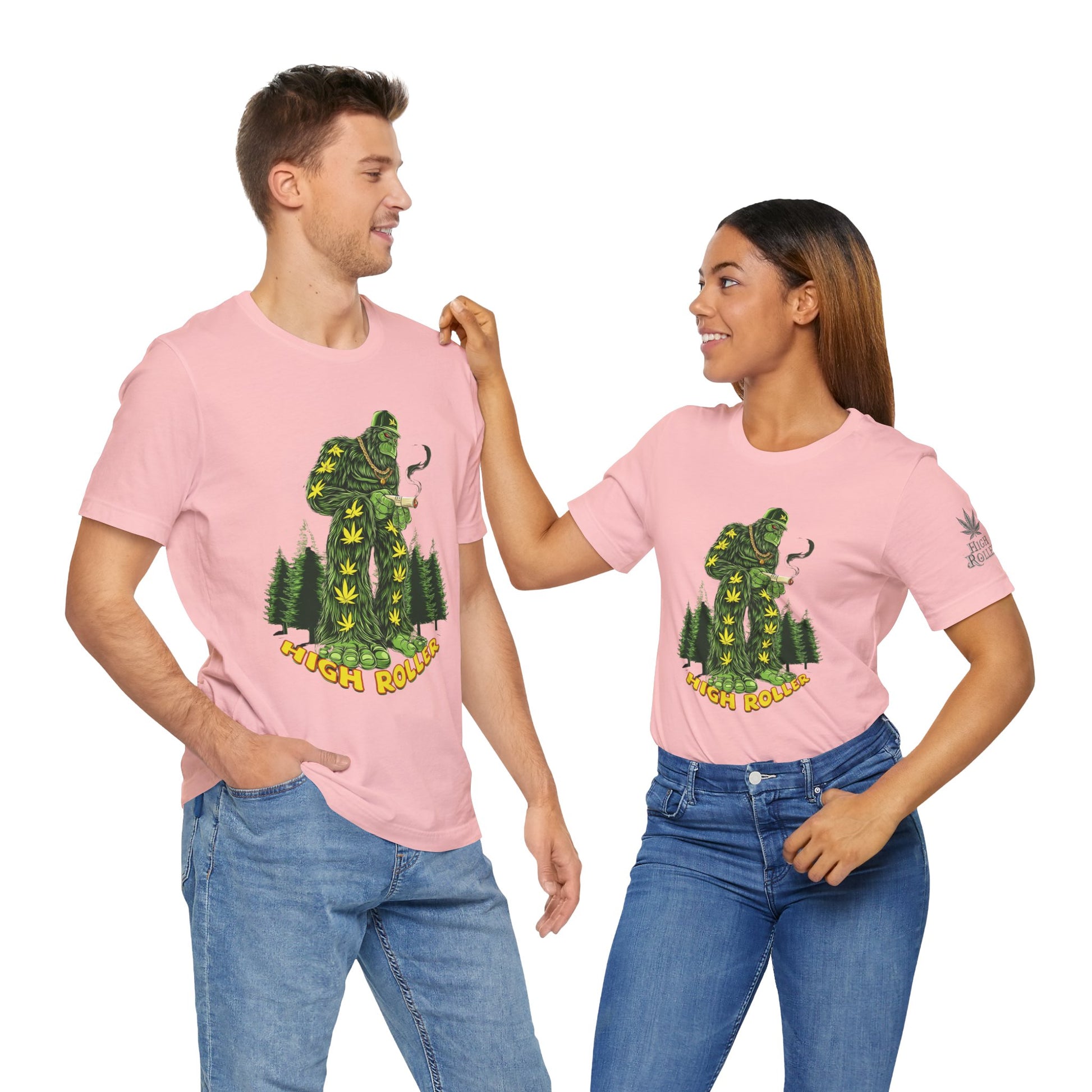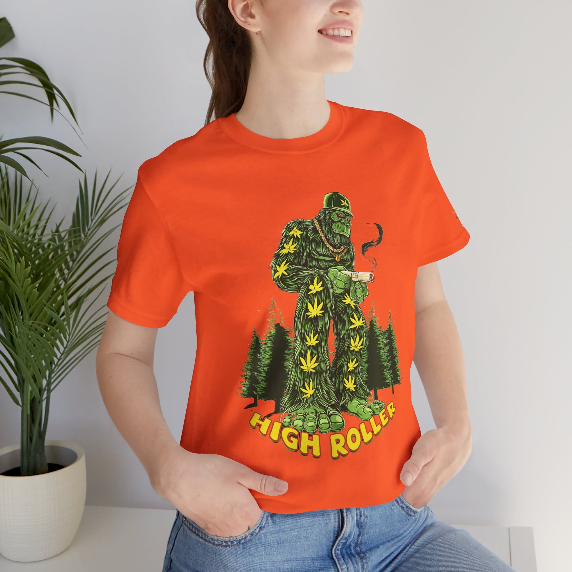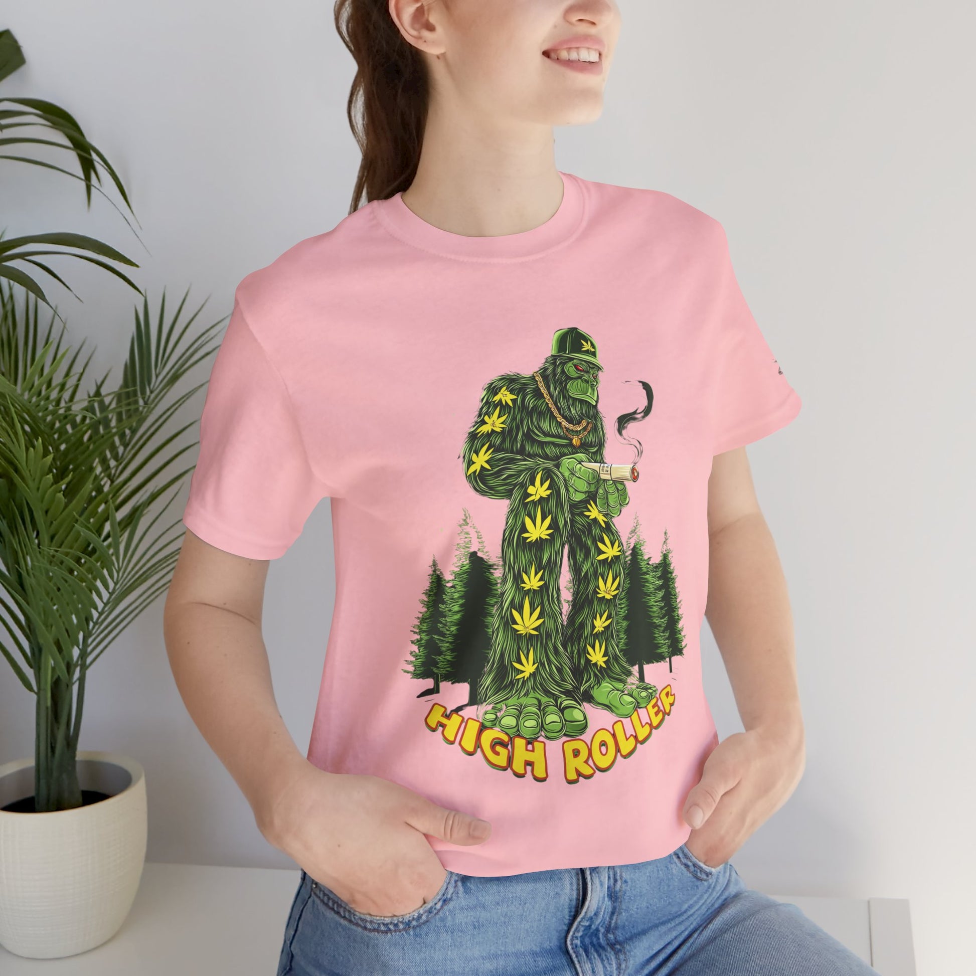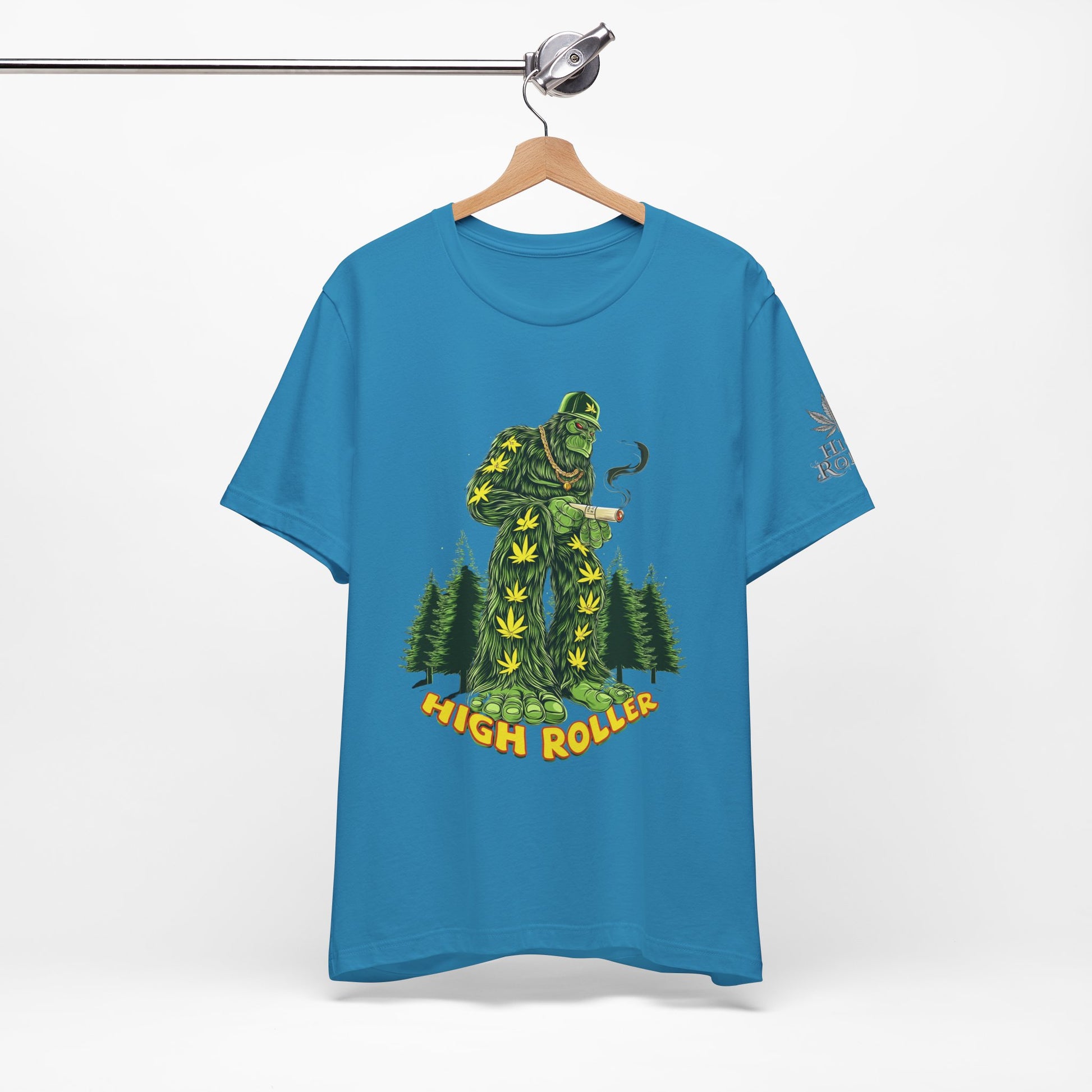 This legendary forest masterpiece features the ultimate cannabis cryptid—a majestic Bigfoot composed entirely of vibrant golden-green cannabis leaves, smoking a ceremonial pipe while standing guard over his evergreen domain, proving that some legends are rooted in more than just folklore. The mythical beast's entire form is crafted from perfectly rendered cannabis foliage that creates natural camouflage for the forest's most elusive HIGH ROLLER, while wisps of smoke curl from his pipe like morning mist through the pines. The composition is grounded by a forest of deep green evergreens and crowned with bold "HIGH ROLLER" lettering in golden yellow, with the subtle "420" sleeve marking identifying this as essential gear for those who understand that Bigfoot stays hidden not from fear but because he's protecting the forest's finest cultivation spots.