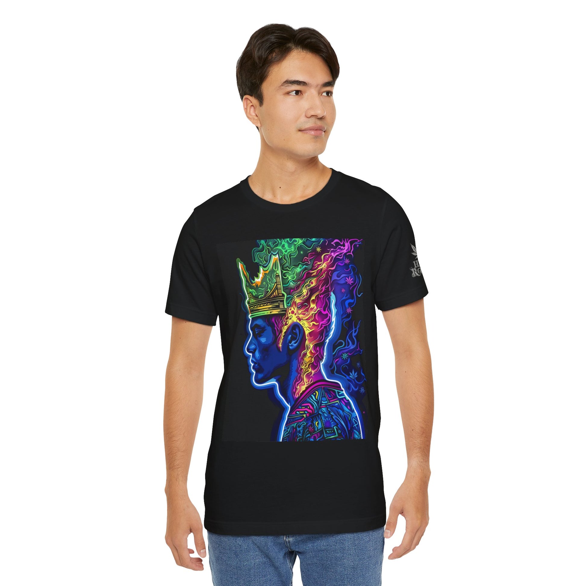 This spectacular neon-lit design celebrates cannabis culture through futuristic royal imagery, featuring a regal profile rendered in luminous electric blue outline against premium black fabric. The figure wears an ornate golden crown that appears to burn with emerald green cannabis smoke, symbolizing elevated royalty and natural wisdom. The most striking element is the explosive rainbow smoke hair that flows upward in mesmerizing waves—transitioning from vibrant greens to electric yellows, hot pinks, deep purples, and brilliant blues. Delicate cannabis leaf silhouettes float throughout the colorful smoke tendrils, integrating seamlessly into the psychedelic hair composition. The figure's attire features intricate neon-outlined details in hot pink and electric blue, suggesting futuristic formal wear or military-inspired luxury fashion. The entire composition glows with blacklight-reactive aesthetics perfect for nightlife, festivals, and rave culture. The contrast between the dark background and brilliant neon colors creates eye-catching visual impact that commands attention in any setting. This design positions cannabis culture within cyberpunk aesthetics, futuristic royalty, and electronic music culture—celebrating elevation, consciousness expansion, and the transformative beauty of cannabis consciousness. The subtle "HIGH ROLLER" sleeve logo marks this as premium lifestyle apparel for those who see cannabis culture as worthy of regal status and artistic celebration through cutting-edge visual expression.