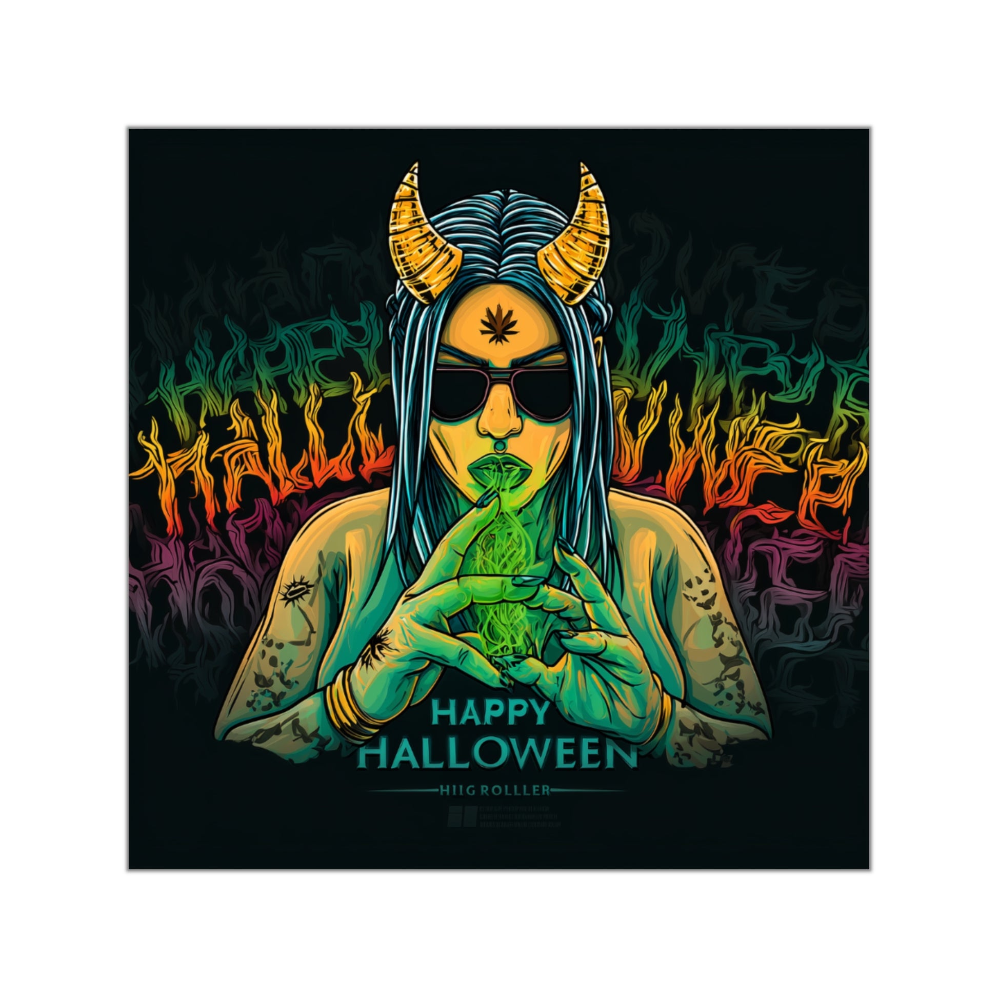 This mesmerizing Halloween sticker presents a golden-skinned demon goddess with ornate amber horns and flowing cyan hair, wearing sleek black sunglasses while performing a sacred cannabis ritual with emerald smoke rising from her mystical apparatus. The devil queen's arms are adorned with intricate botanical tattoos, her forehead marked with a cannabis leaf third eye, as rainbow flames spell out "HAPPY HALLOWEEN" in a psychedelic spectrum that transitions from deep purple through vibrant greens to fiery oranges. The composition features "HIGH ROLLER" branded below in subtle elegance, with the entire scene pulsing with supernatural energy against the void-black background, creating a collectible piece that speaks to those who understand that true HIGH ROLLERS celebrate Halloween by channeling both infernal beauty and premium botanical enlightenment.