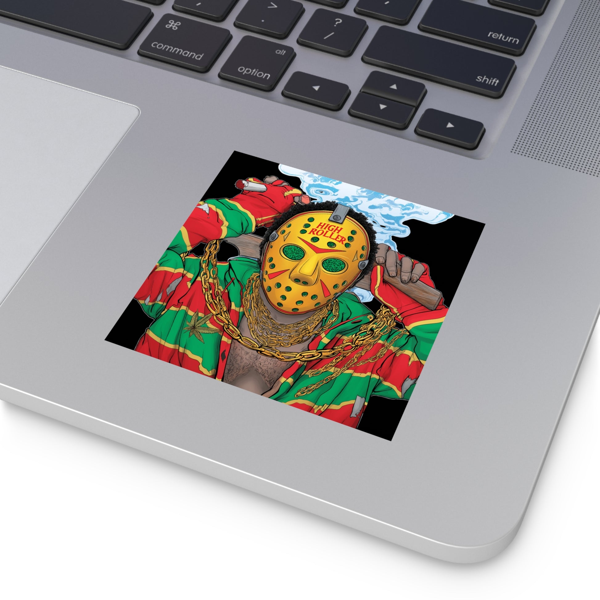 This legendary Halloween sticker reimagines the iconic slasher in a golden hockey mask emblazoned with "HIGH ROLLER" across the forehead, the eye holes filled with emerald cannabis nuggets while he rocks a vibrant Rasta-colored hoodie in red, green, and yellow stripes. The masked legend raises his arms in triumph while wielding his wooden tool, ethereal blue smoke billowing upward in artistic swirls as massive golden chains drape around his neck like trophies from Camp Crystal Lake's most elevated survivor. The composition features cannabis leaves integrated into the design, with the character's chest displaying intricate tattoo patterns visible beneath the layers, creating a collectible piece that speaks to those who understand that true HIGH ROLLERS celebrate Halloween by transforming horror icons into cannabis culture champions.