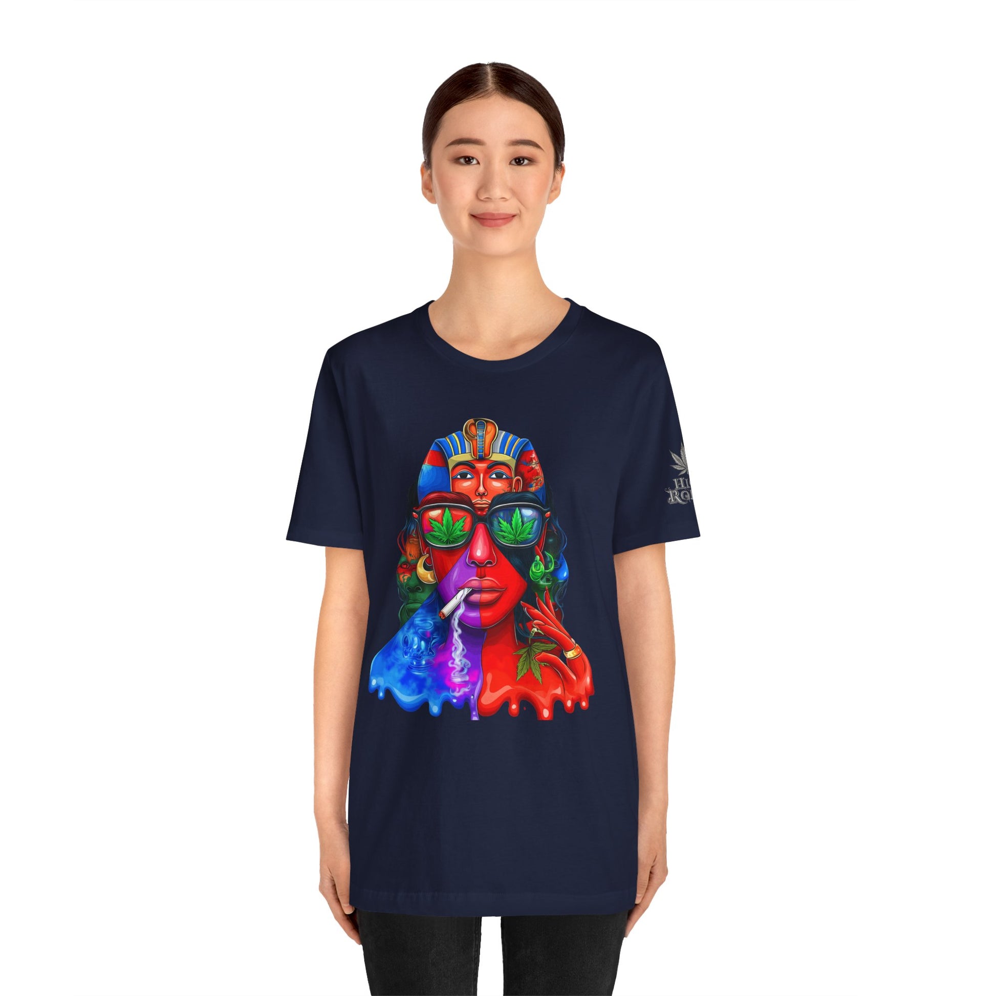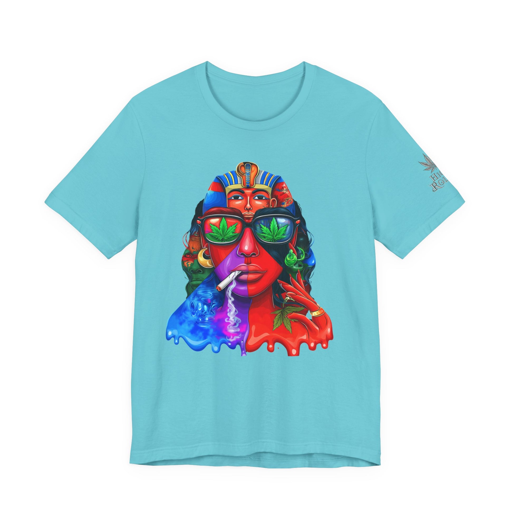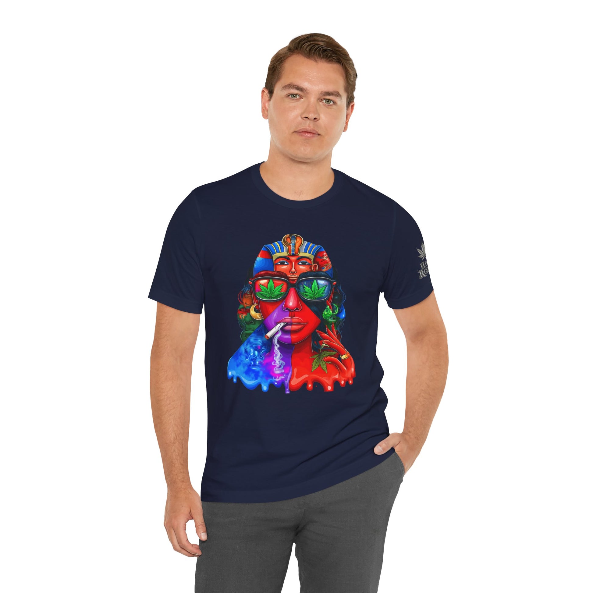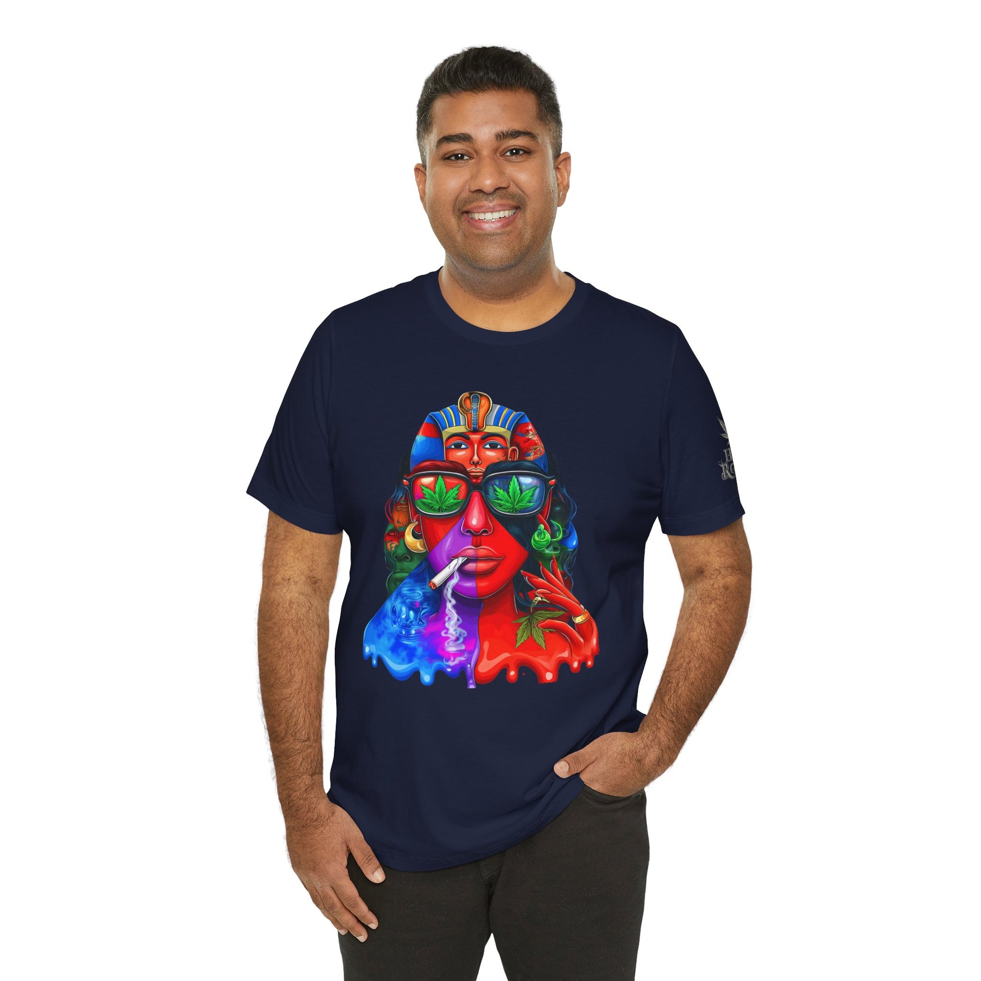 Constructed on premium Bella+Canvas Airlume combed and ring-spun cotton, this tee provides exceptional comfort worthy of pharaoh-level luxury. The retail-fit construction with side seams ensures the garment maintains its sophisticated structure through countless wears, while the tear-away label eliminates any distraction from the commanding visual statement. State-of-the-art direct-to-garment printing technology reproduces every vibrant color transition with stunning precision—from the electric blue glow effects to the fiery red cascades to the luminous green cannabis leaf reflections in the sunglasses. The intricate pharaoh headdress details maintain crisp definition while the psychedelic drip effects create authentic paint-flow dimension. The fabric weight delivers substantial quality that supports the complex multi-color artwork while maintaining breathability for festival crowds, concerts, or everyday wear. Available in sizes XS through 5XL, this unisex design welcomes all body types into the celebration of cannabis culture's ancient roots and contemporary expression while delivering the premium quality and bold aesthetic that defines HIGH ROLLER's commitment to elevating cannabis lifestyle apparel beyond stereotypes into legitimate artistic excellence.