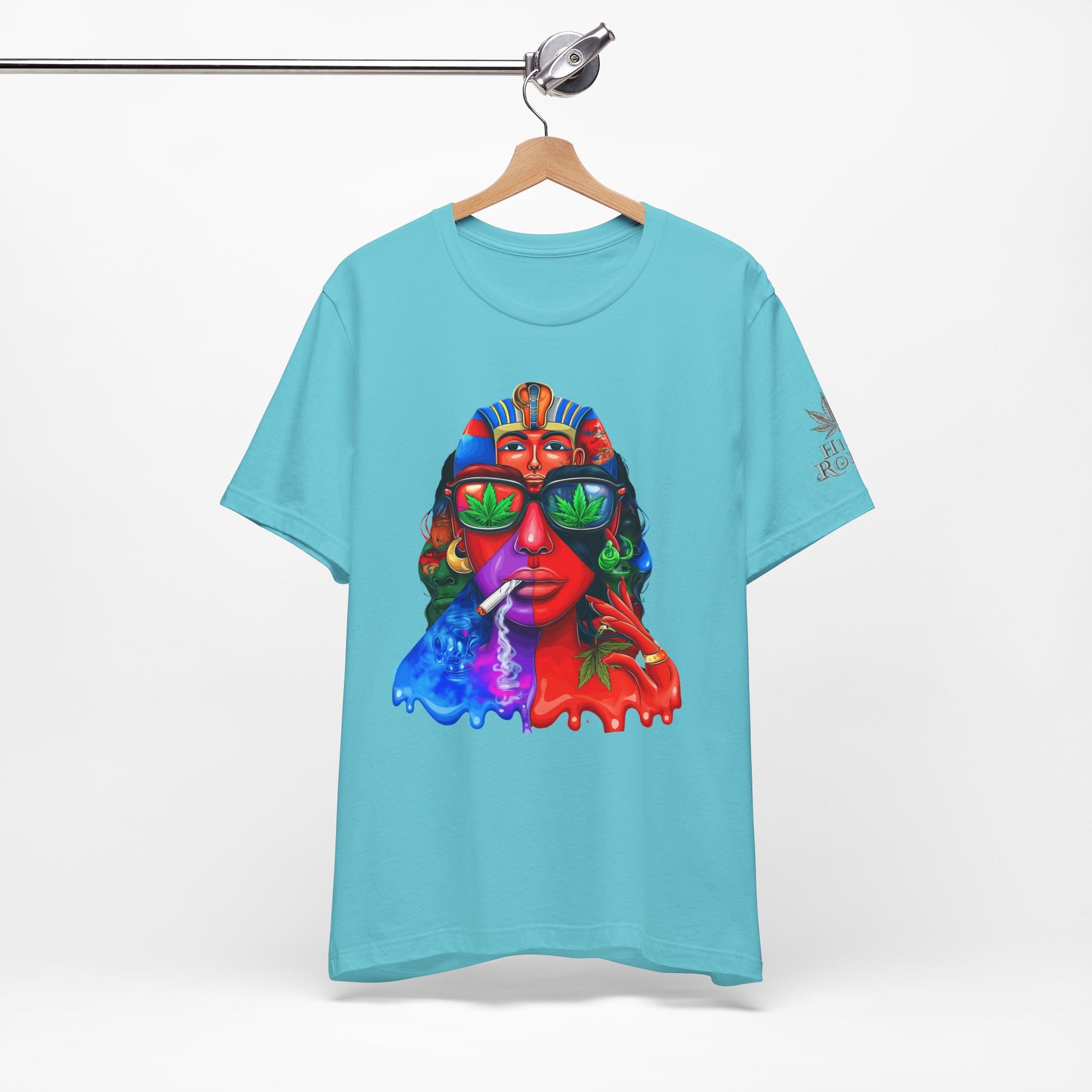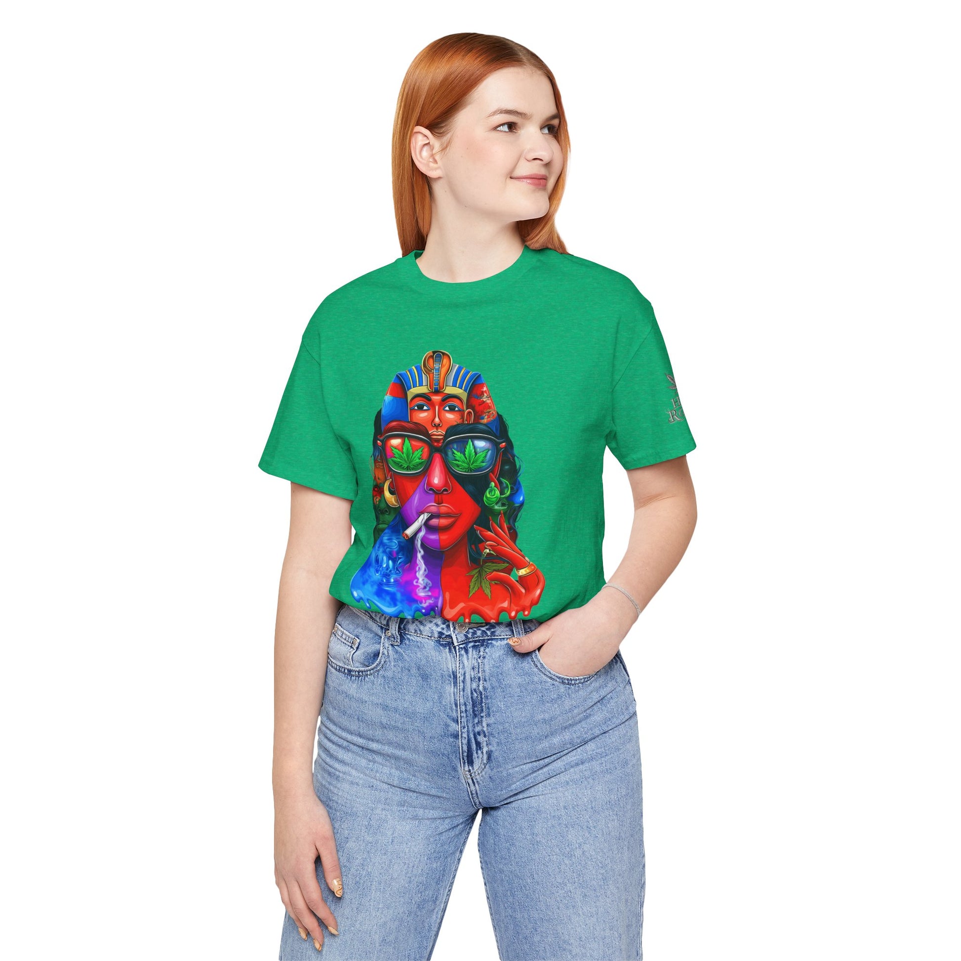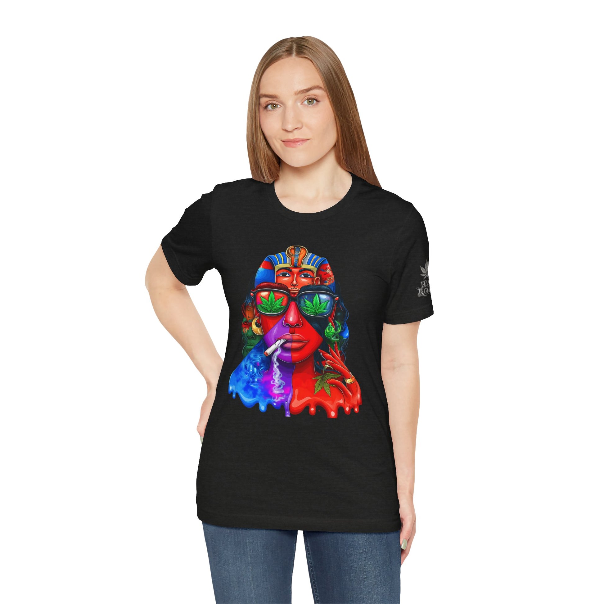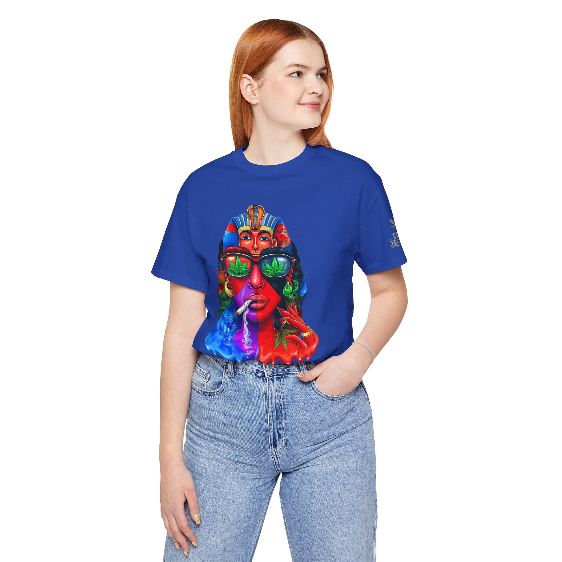 Constructed on premium Bella+Canvas Airlume combed and ring-spun cotton, this tee provides exceptional comfort worthy of pharaoh-level luxury. The retail-fit construction with side seams ensures the garment maintains its sophisticated structure through countless wears, while the tear-away label eliminates any distraction from the commanding visual statement. State-of-the-art direct-to-garment printing technology reproduces every vibrant color transition with stunning precision—from the electric blue glow effects to the fiery red cascades to the luminous green cannabis leaf reflections in the sunglasses. The intricate pharaoh headdress details maintain crisp definition while the psychedelic drip effects create authentic paint-flow dimension. The fabric weight delivers substantial quality that supports the complex multi-color artwork while maintaining breathability for festival crowds, concerts, or everyday wear. Available in sizes XS through 5XL, this unisex design welcomes all body types into the celebration of cannabis culture's ancient roots and contemporary expression while delivering the premium quality and bold aesthetic that defines HIGH ROLLER's commitment to elevating cannabis lifestyle apparel beyond stereotypes into legitimate artistic excellence.