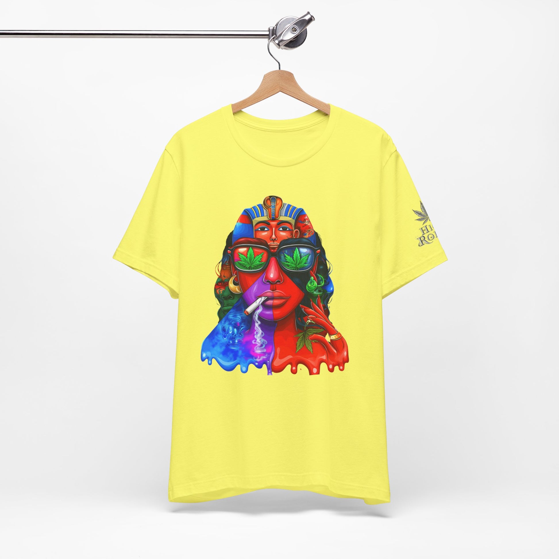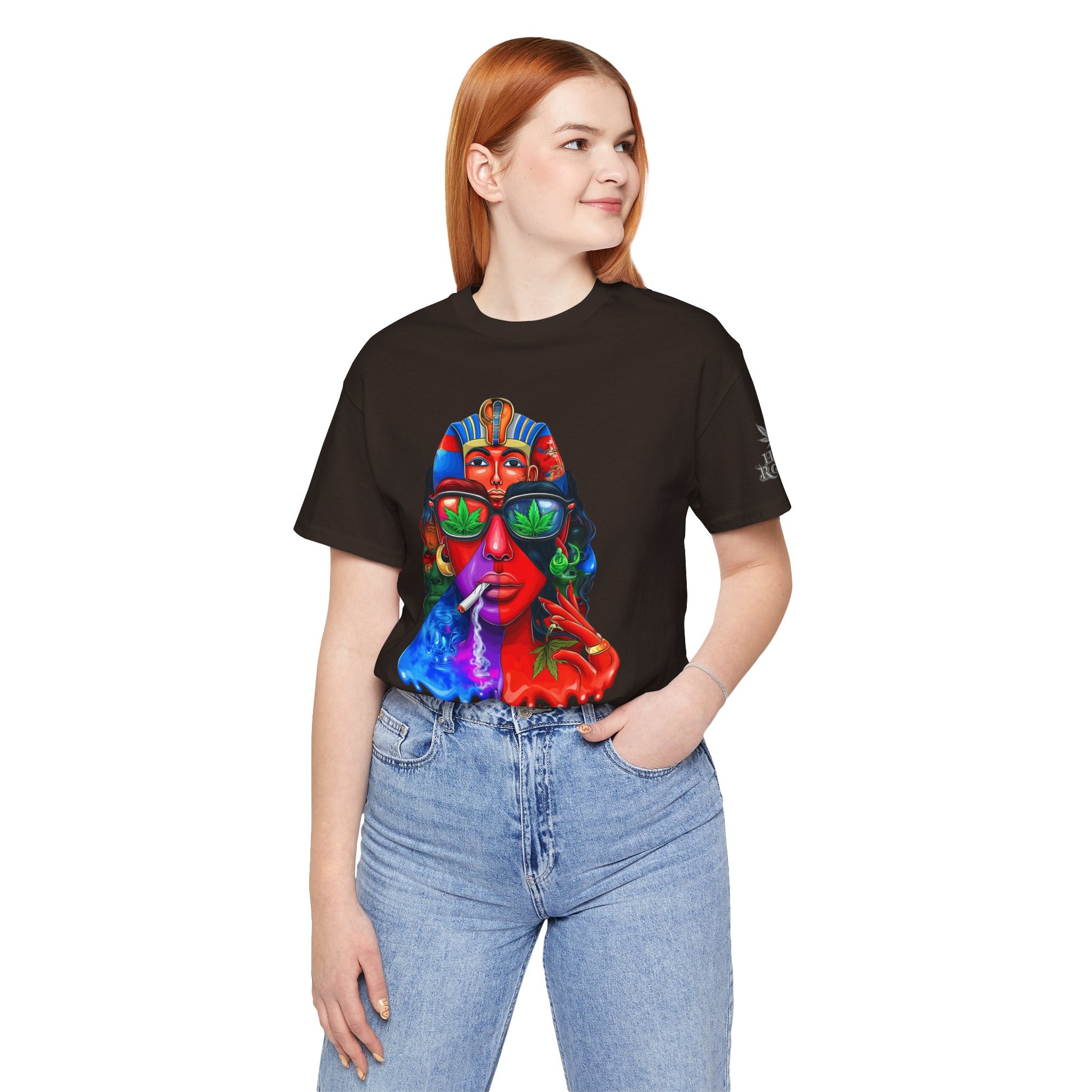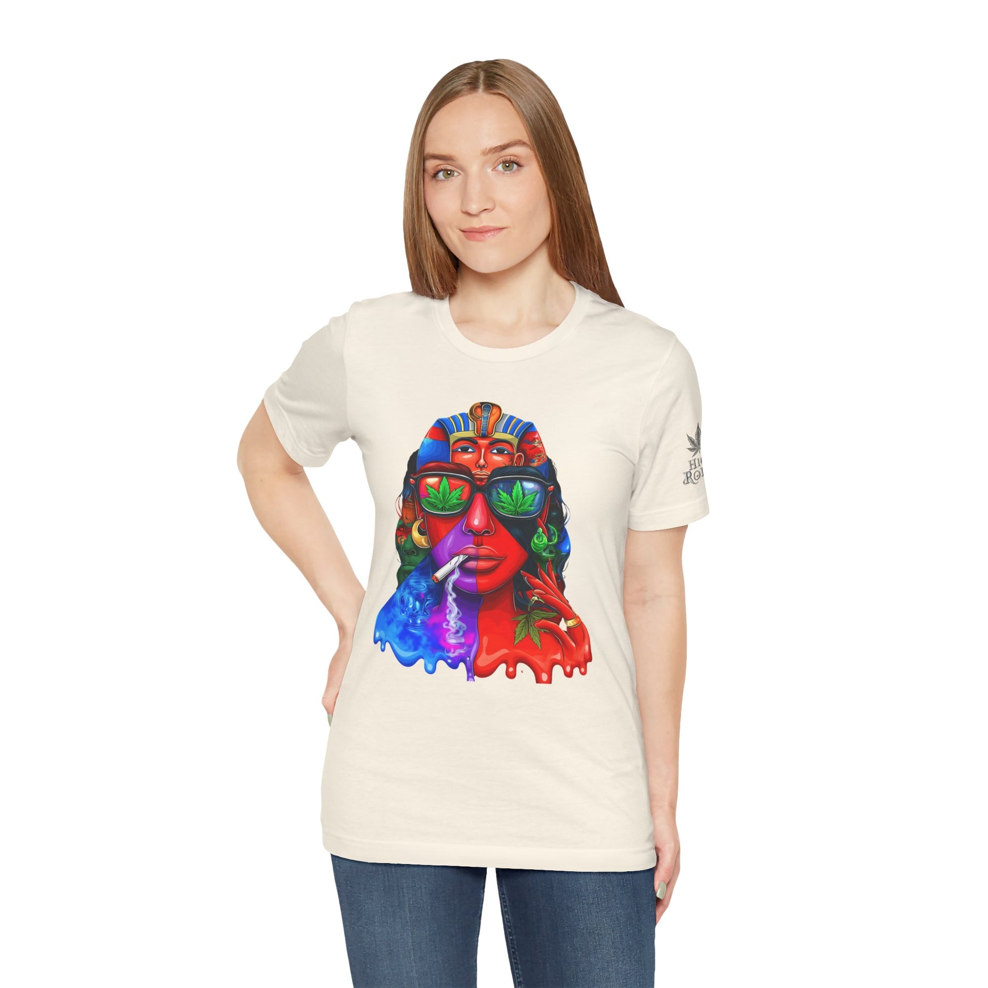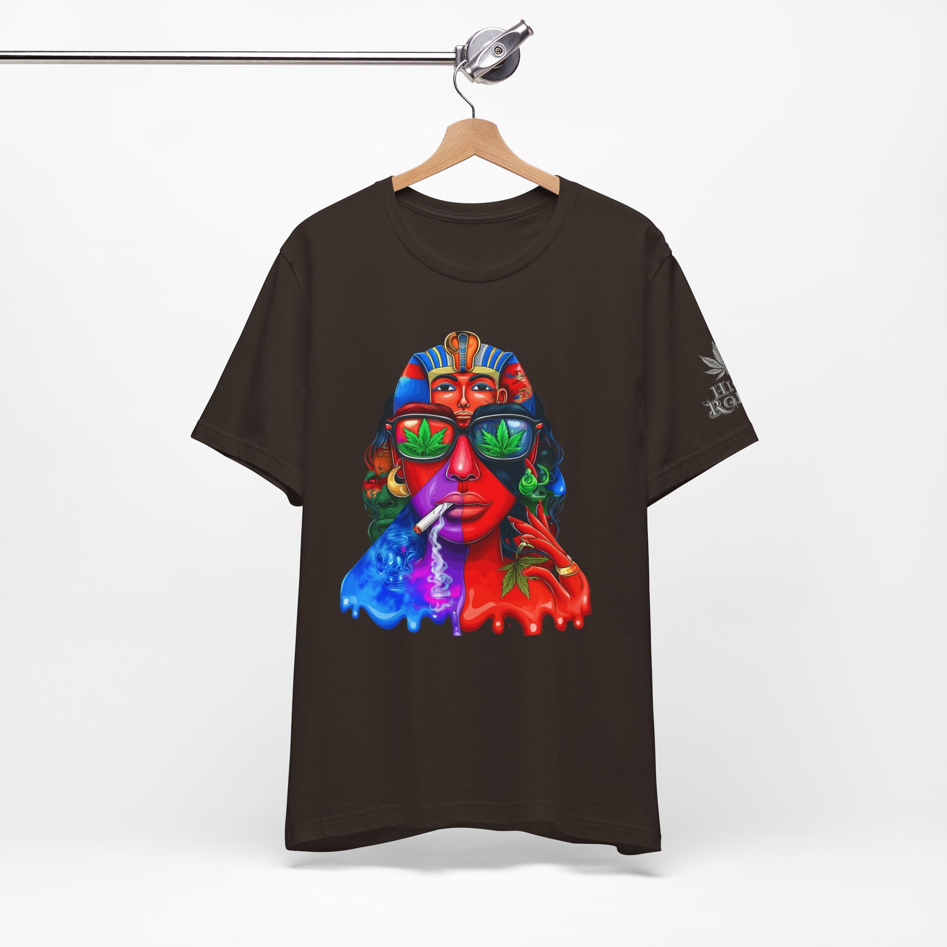 Constructed on premium Bella+Canvas Airlume combed and ring-spun cotton, this tee provides exceptional comfort worthy of pharaoh-level luxury. The retail-fit construction with side seams ensures the garment maintains its sophisticated structure through countless wears, while the tear-away label eliminates any distraction from the commanding visual statement. State-of-the-art direct-to-garment printing technology reproduces every vibrant color transition with stunning precision—from the electric blue glow effects to the fiery red cascades to the luminous green cannabis leaf reflections in the sunglasses. The intricate pharaoh headdress details maintain crisp definition while the psychedelic drip effects create authentic paint-flow dimension. The fabric weight delivers substantial quality that supports the complex multi-color artwork while maintaining breathability for festival crowds, concerts, or everyday wear. Available in sizes XS through 5XL, this unisex design welcomes all body types into the celebration of cannabis culture's ancient roots and contemporary expression while delivering the premium quality and bold aesthetic that defines HIGH ROLLER's commitment to elevating cannabis lifestyle apparel beyond stereotypes into legitimate artistic excellence.