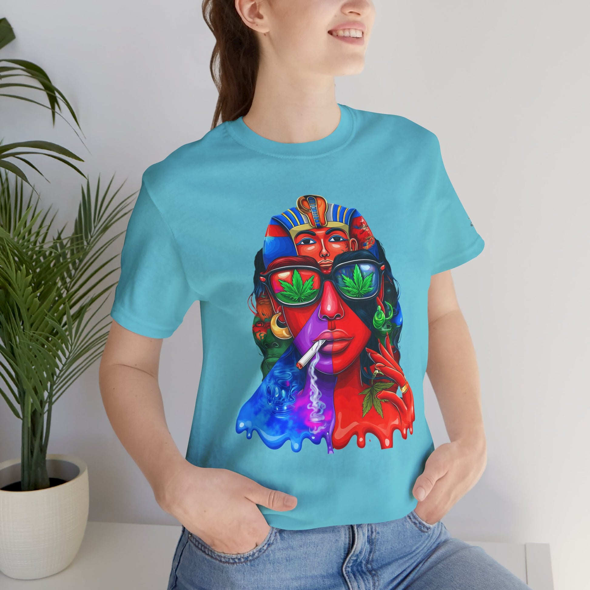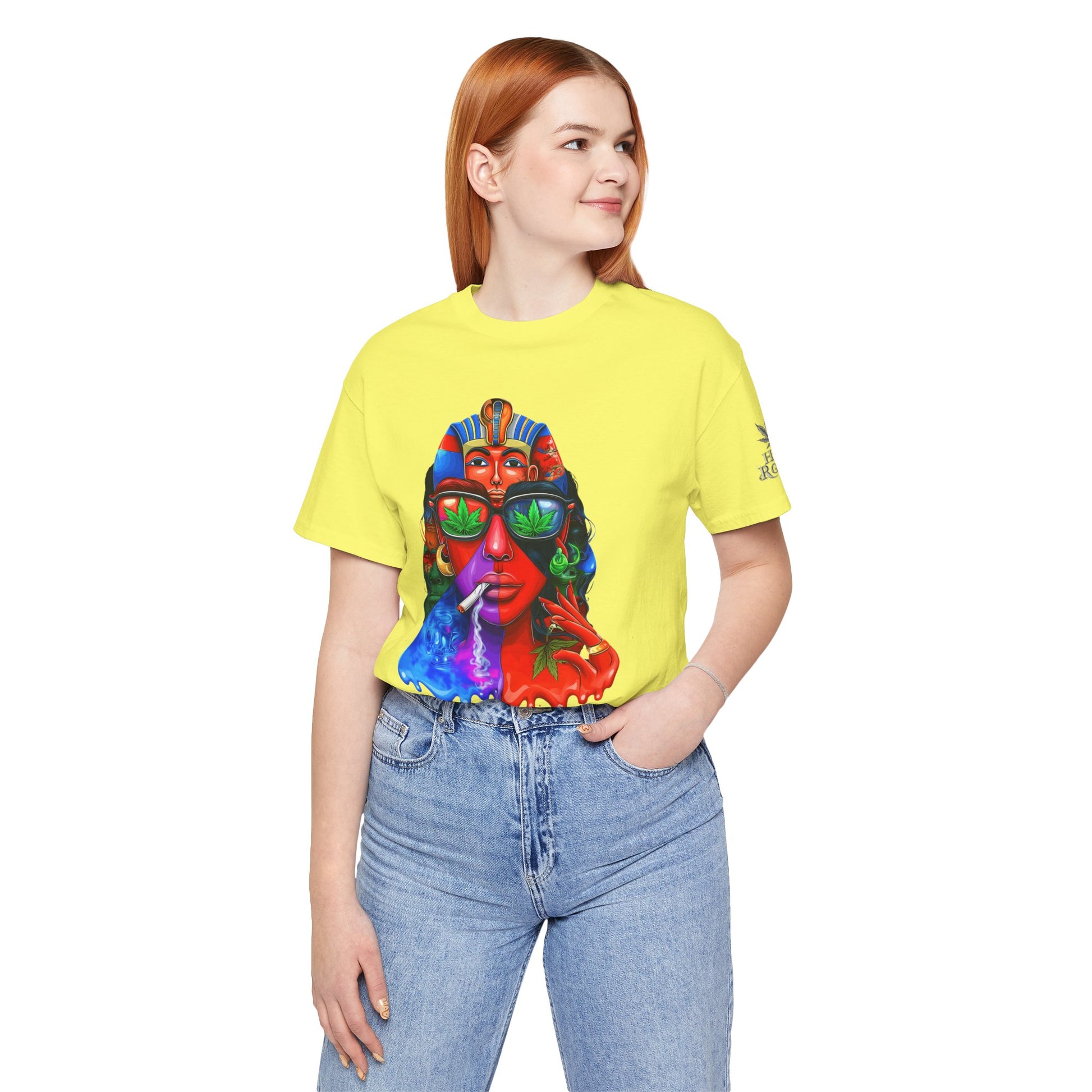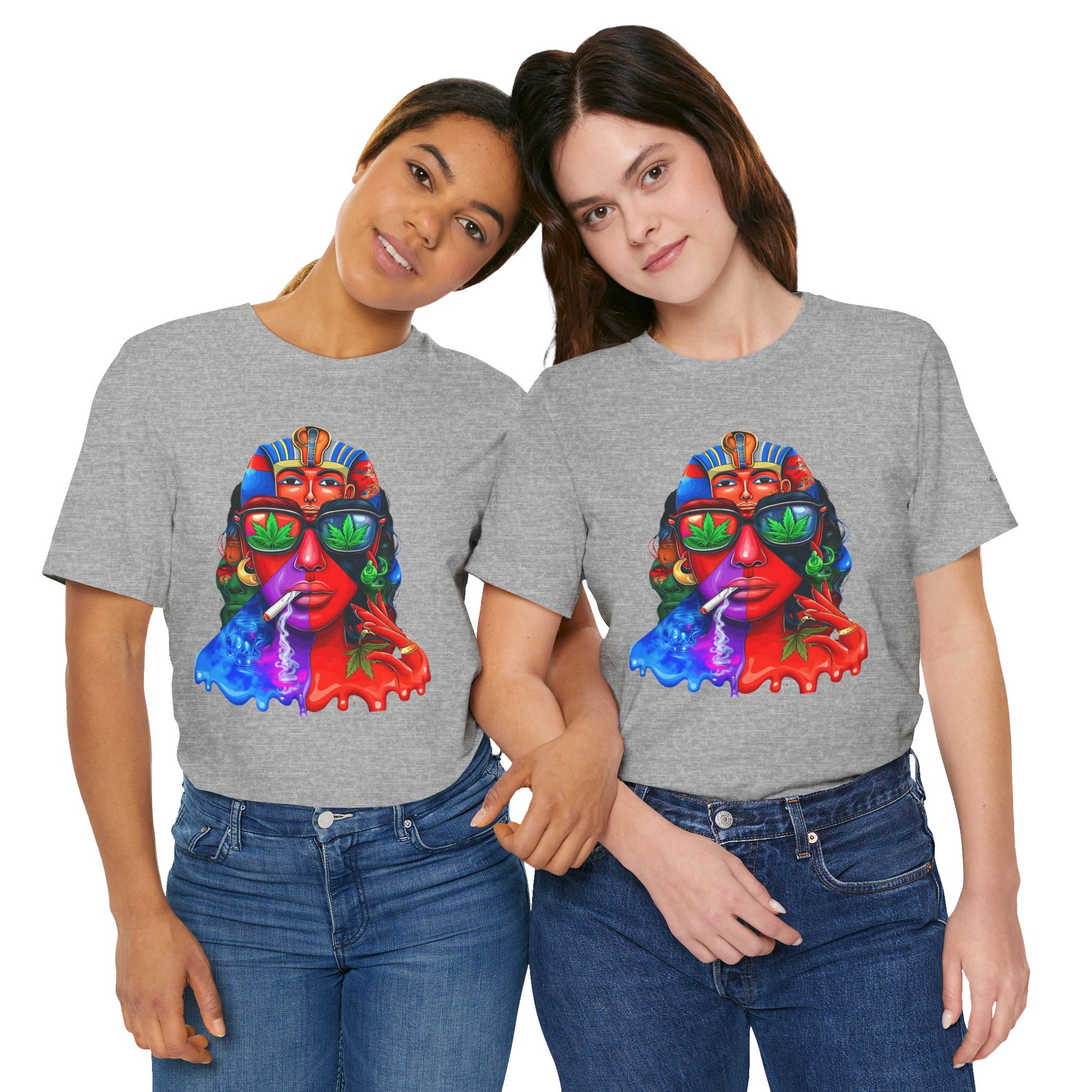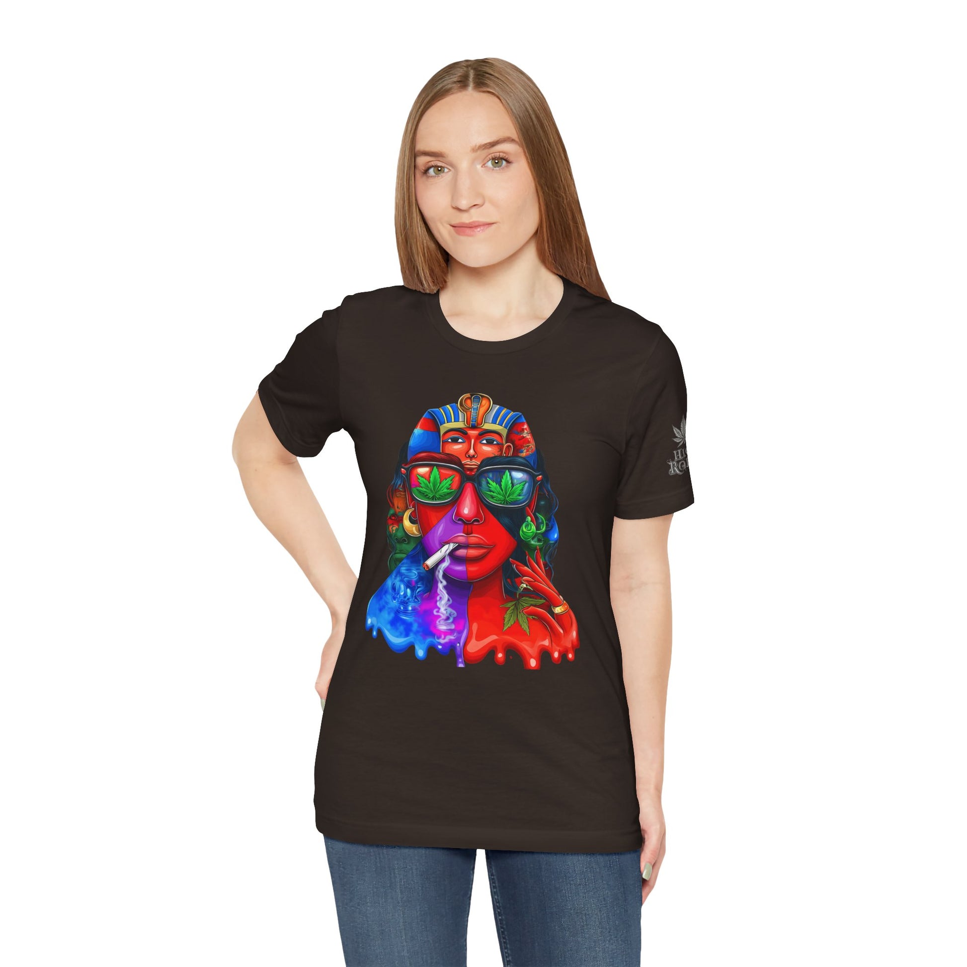 Constructed on premium Bella+Canvas Airlume combed and ring-spun cotton, this tee provides exceptional comfort worthy of pharaoh-level luxury. The retail-fit construction with side seams ensures the garment maintains its sophisticated structure through countless wears, while the tear-away label eliminates any distraction from the commanding visual statement. State-of-the-art direct-to-garment printing technology reproduces every vibrant color transition with stunning precision—from the electric blue glow effects to the fiery red cascades to the luminous green cannabis leaf reflections in the sunglasses. The intricate pharaoh headdress details maintain crisp definition while the psychedelic drip effects create authentic paint-flow dimension. The fabric weight delivers substantial quality that supports the complex multi-color artwork while maintaining breathability for festival crowds, concerts, or everyday wear. Available in sizes XS through 5XL, this unisex design welcomes all body types into the celebration of cannabis culture's ancient roots and contemporary expression while delivering the premium quality and bold aesthetic that defines HIGH ROLLER's commitment to elevating cannabis lifestyle apparel beyond stereotypes into legitimate artistic excellence.
