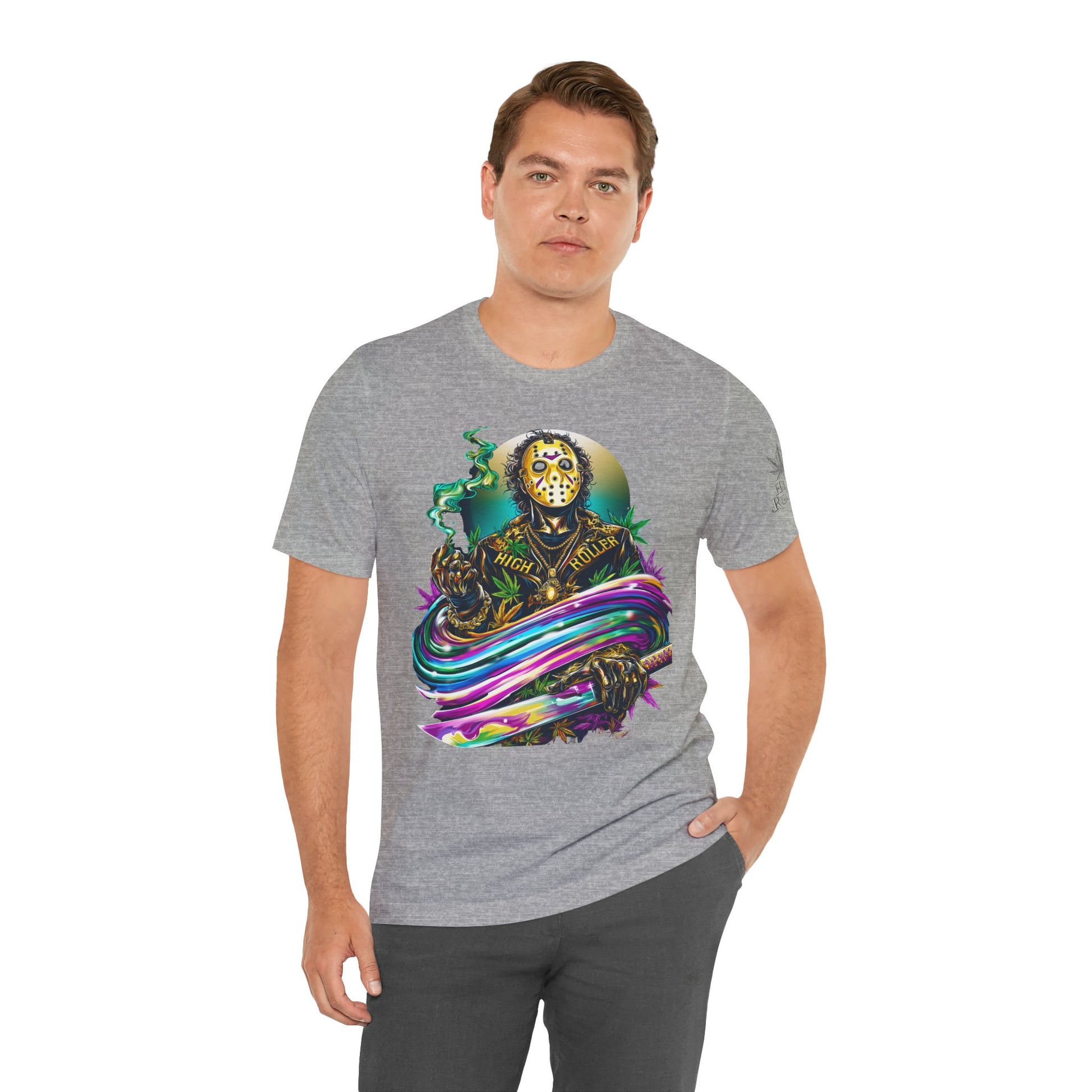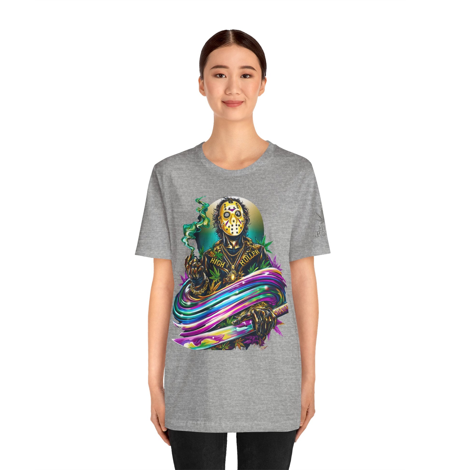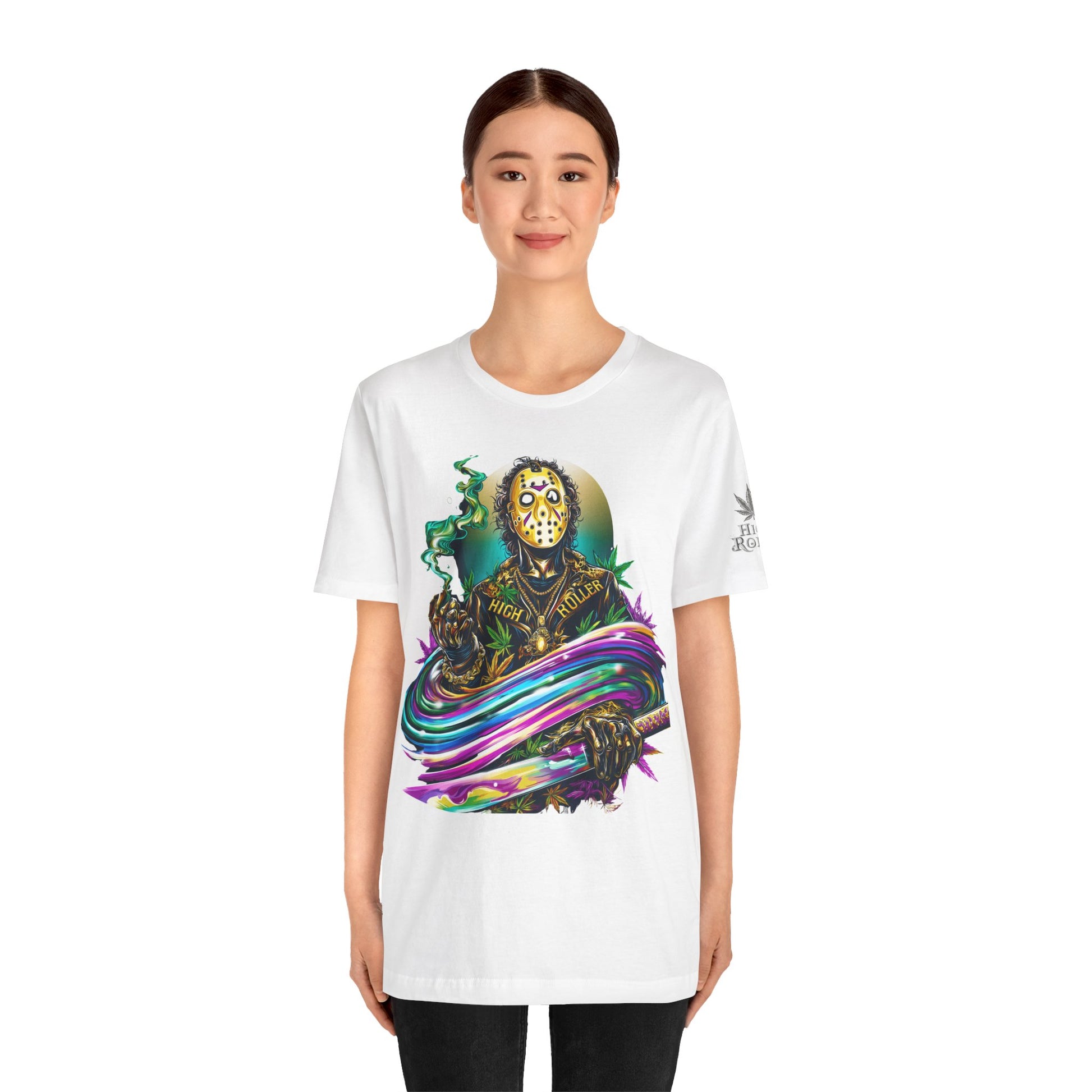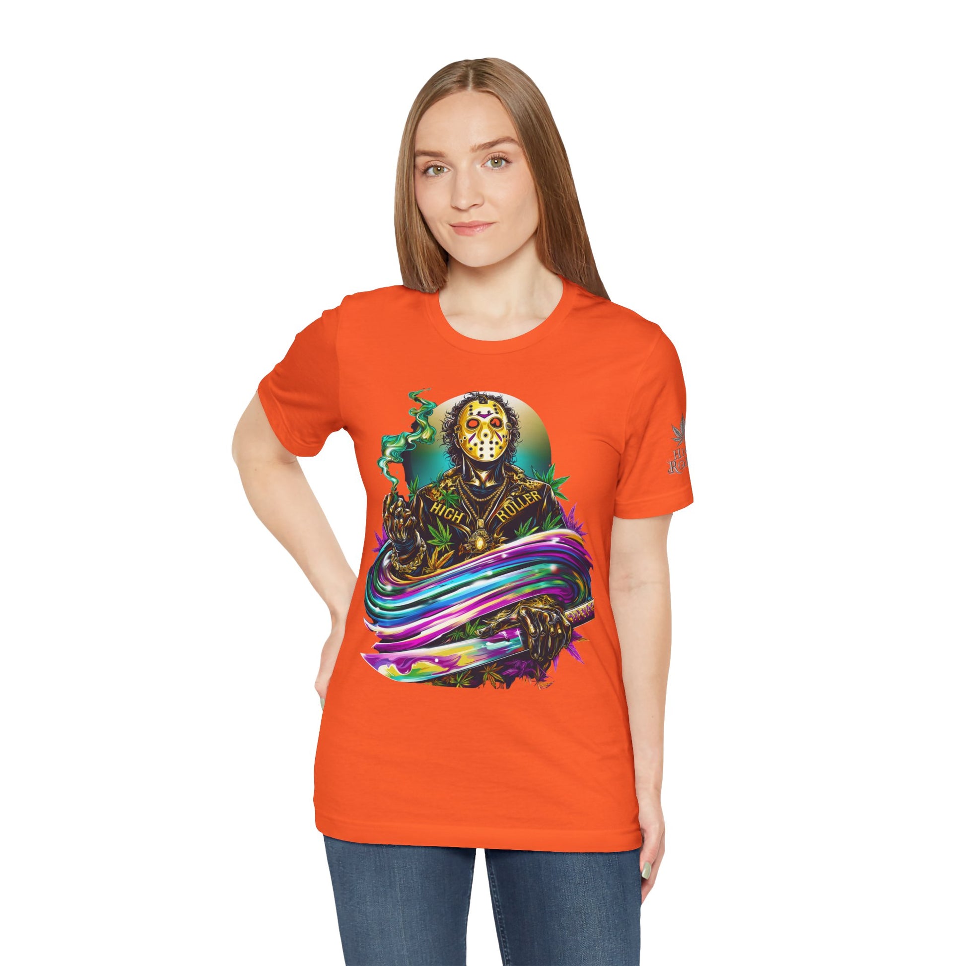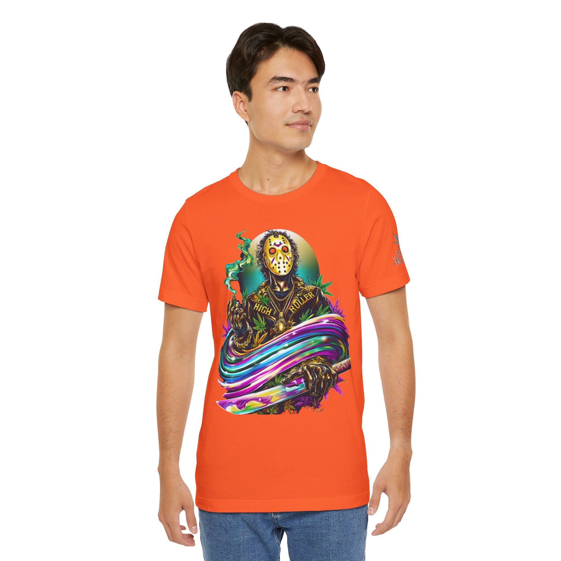 This rainbow-wielding Jason represents the HIGH ROLLER who fearlessly combines horror iconography with psychedelic cannabis culture, understanding that sometimes the most terrifying thing is how good life can be when you're properly elevated with premium flower and killer fashion. The design speaks to sophisticated thrill-seekers who appreciate that even immortal killers can evolve into brand ambassadors for the higher consciousness movement, proving that HIGH ROLLER philosophy extends to those brave enough to wear orange and wield rainbow weapons. By wearing this piece, you're declaring yourself unafraid of color, horror, or consciousness expansion, transforming Jason from nightmare fuel into a psychedelic prophet who proves that the real Camp Crystal Lake experience involves camping under the stars with premium cannabis and friends who appreciate both horror and haute couture.