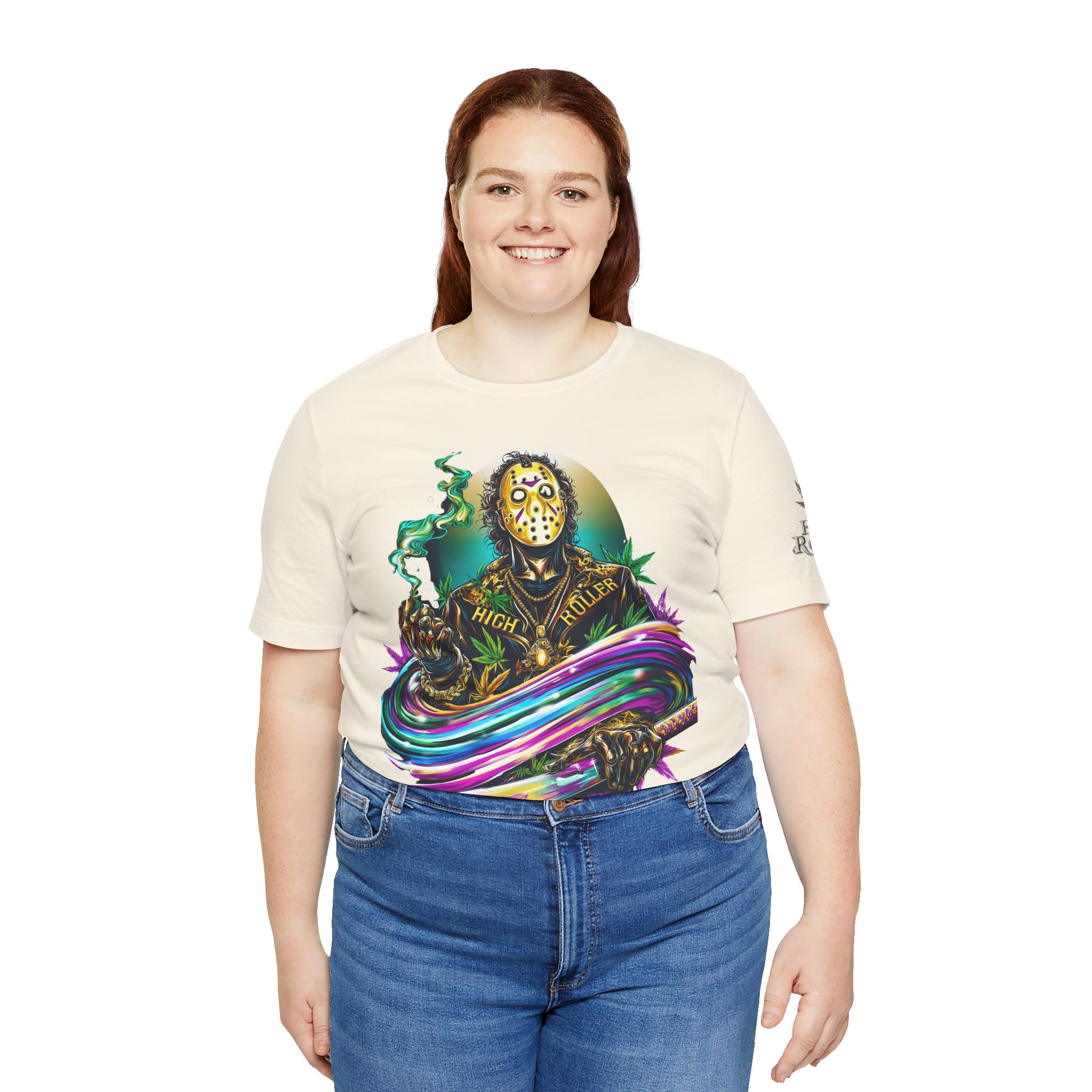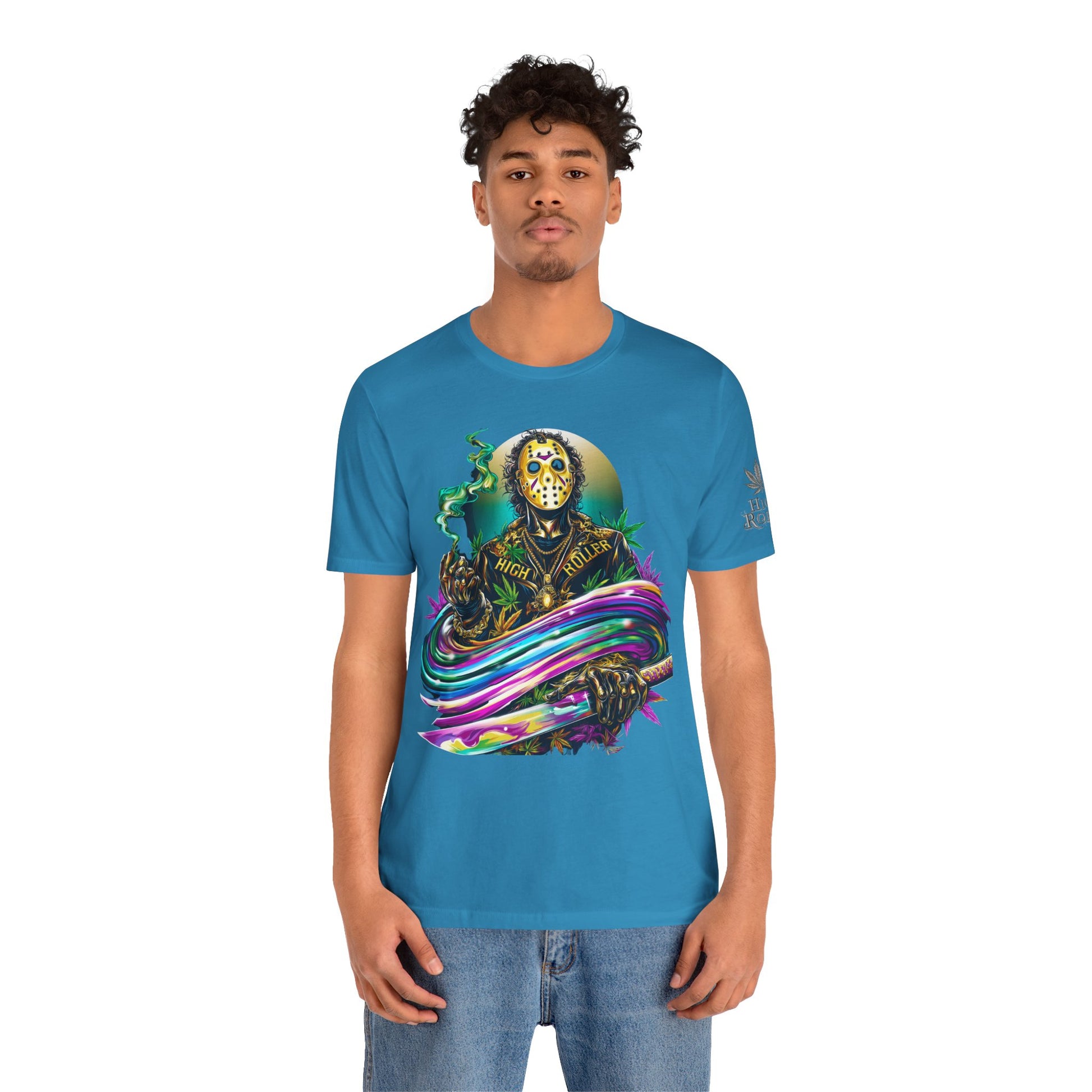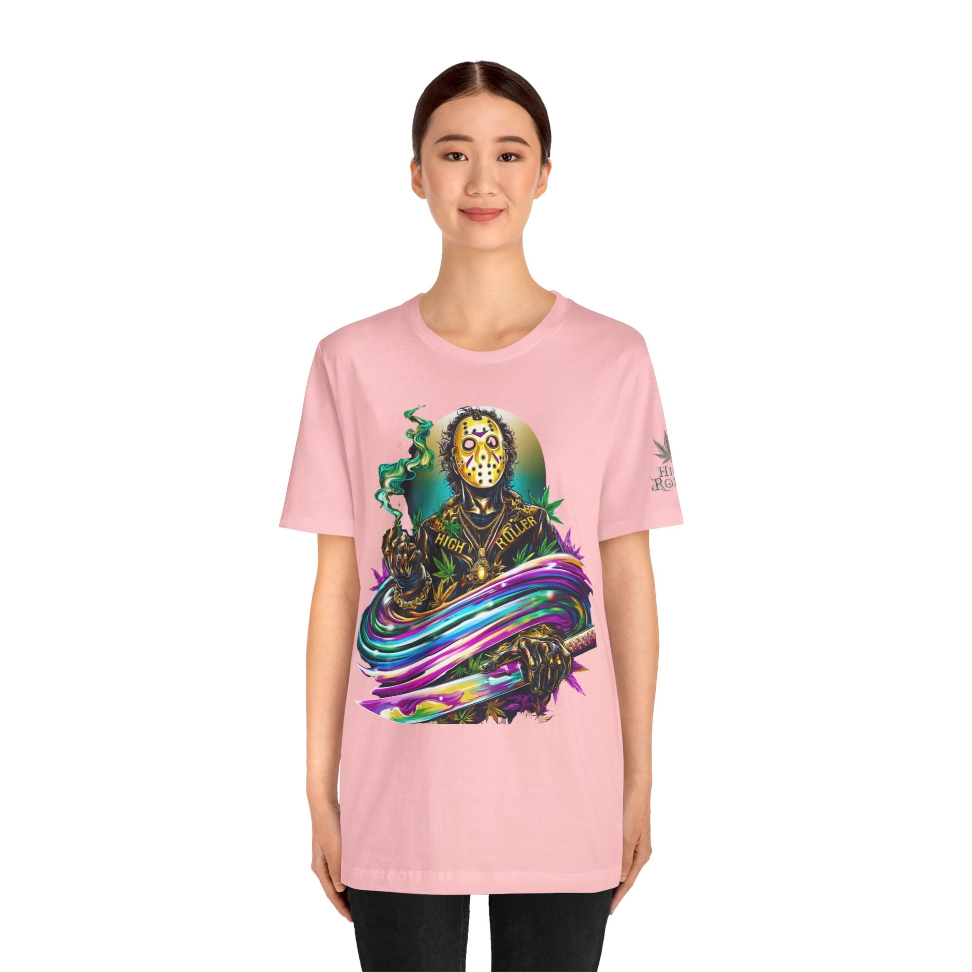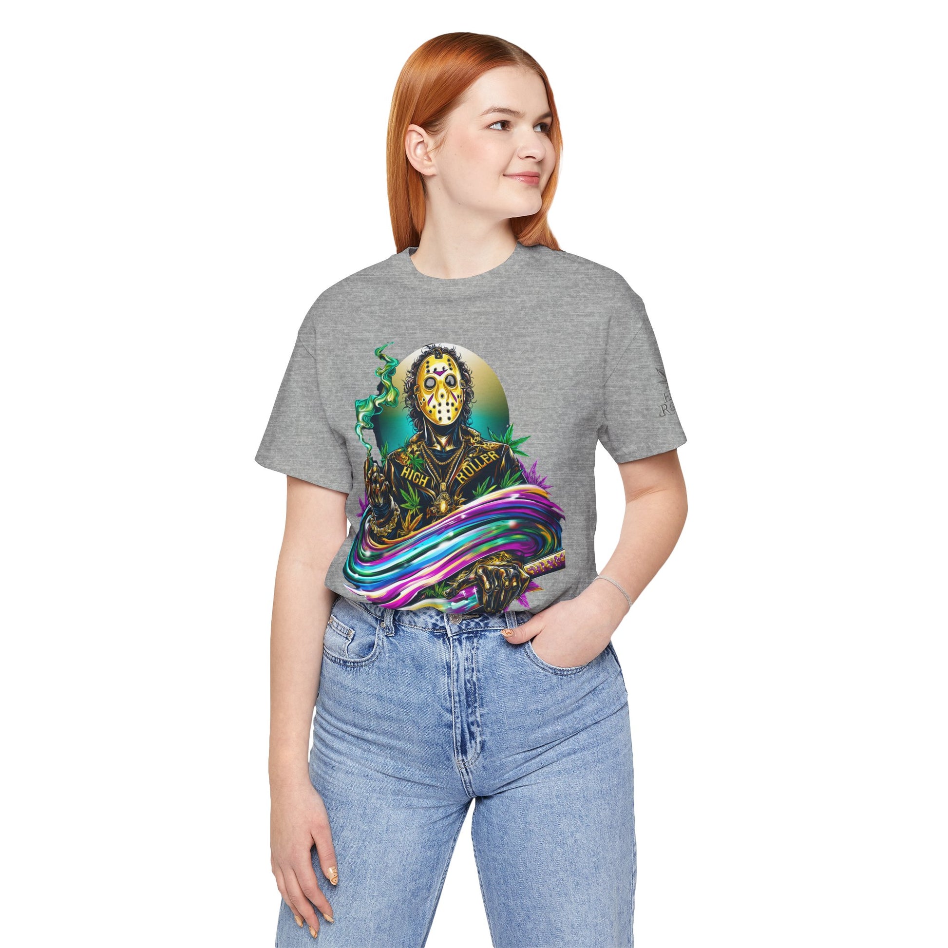 This rainbow-wielding Jason represents the HIGH ROLLER who fearlessly combines horror iconography with psychedelic cannabis culture, understanding that sometimes the most terrifying thing is how good life can be when you're properly elevated with premium flower and killer fashion. The design speaks to sophisticated thrill-seekers who appreciate that even immortal killers can evolve into brand ambassadors for the higher consciousness movement, proving that HIGH ROLLER philosophy extends to those brave enough to wear orange and wield rainbow weapons. By wearing this piece, you're declaring yourself unafraid of color, horror, or consciousness expansion, transforming Jason from nightmare fuel into a psychedelic prophet who proves that the real Camp Crystal Lake experience involves camping under the stars with premium cannabis and friends who appreciate both horror and haute couture.