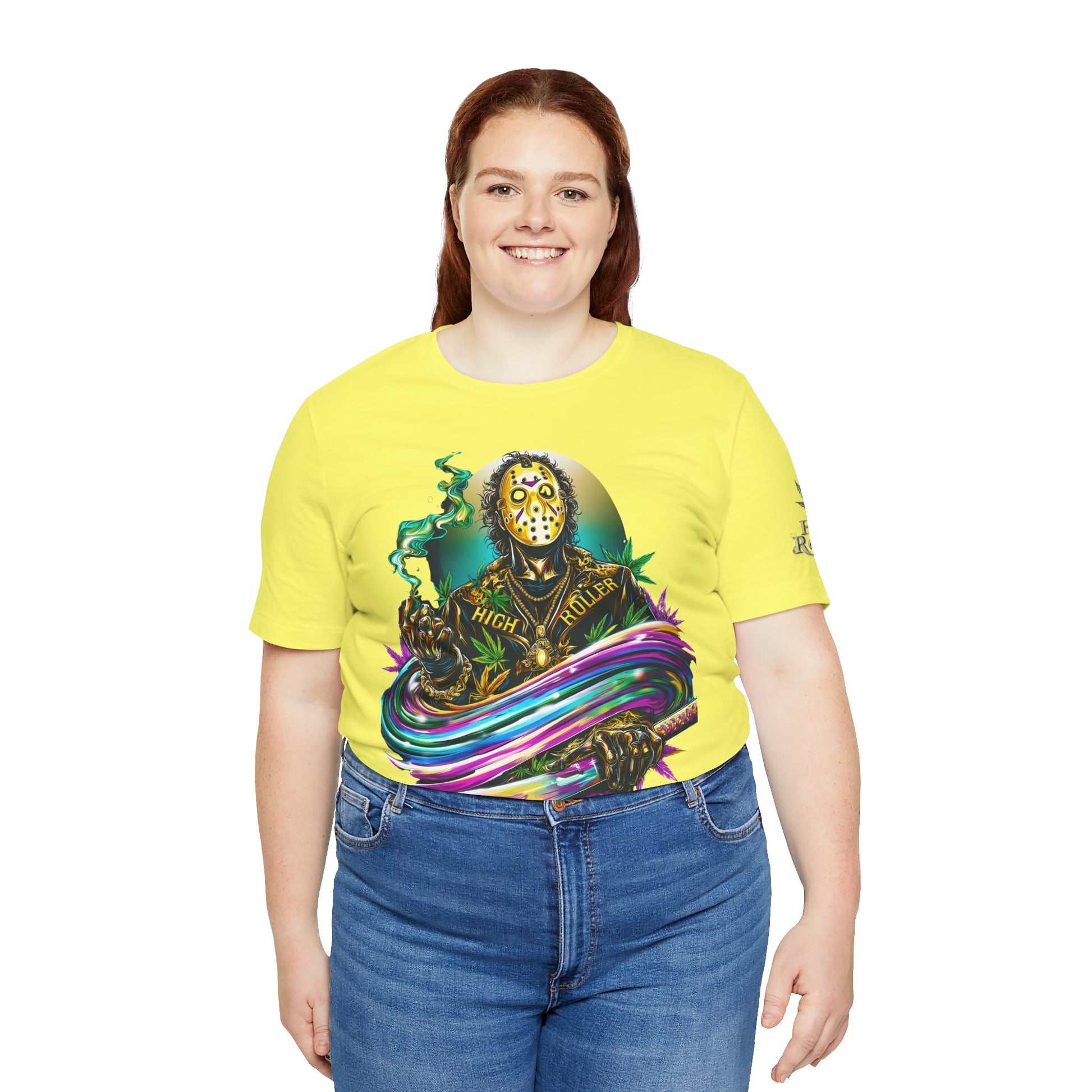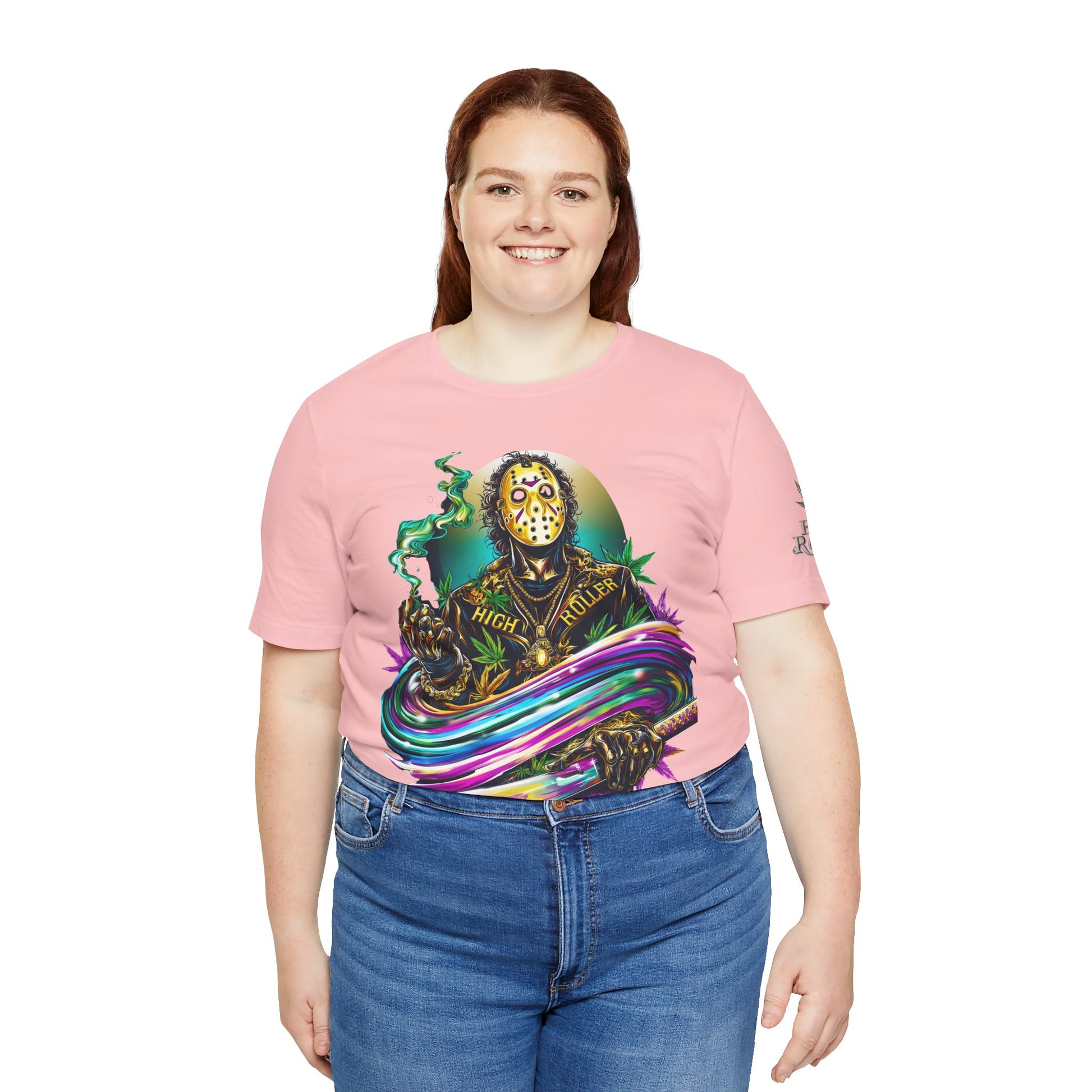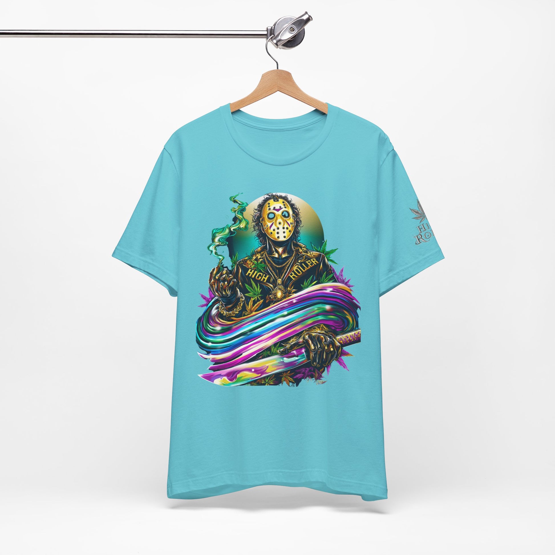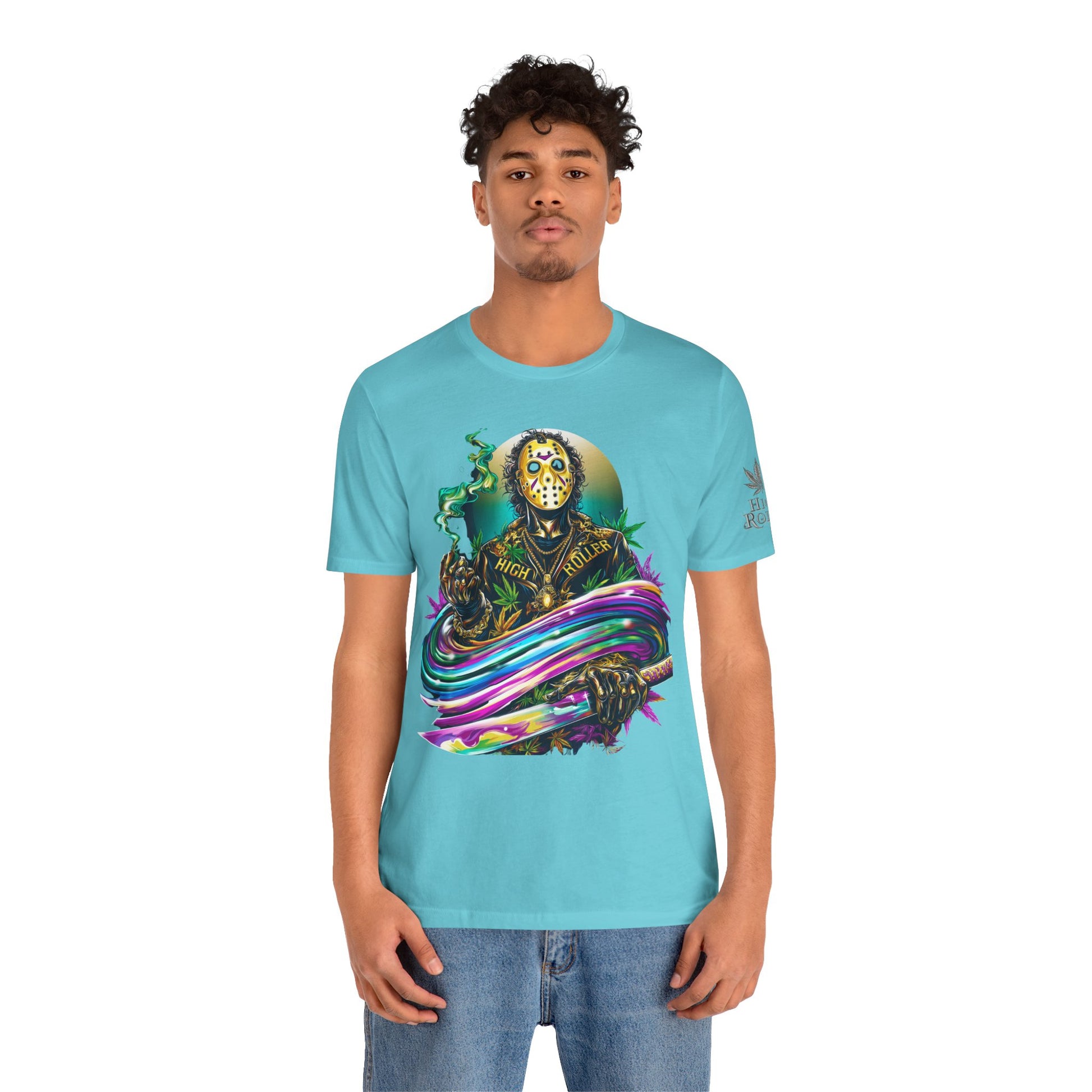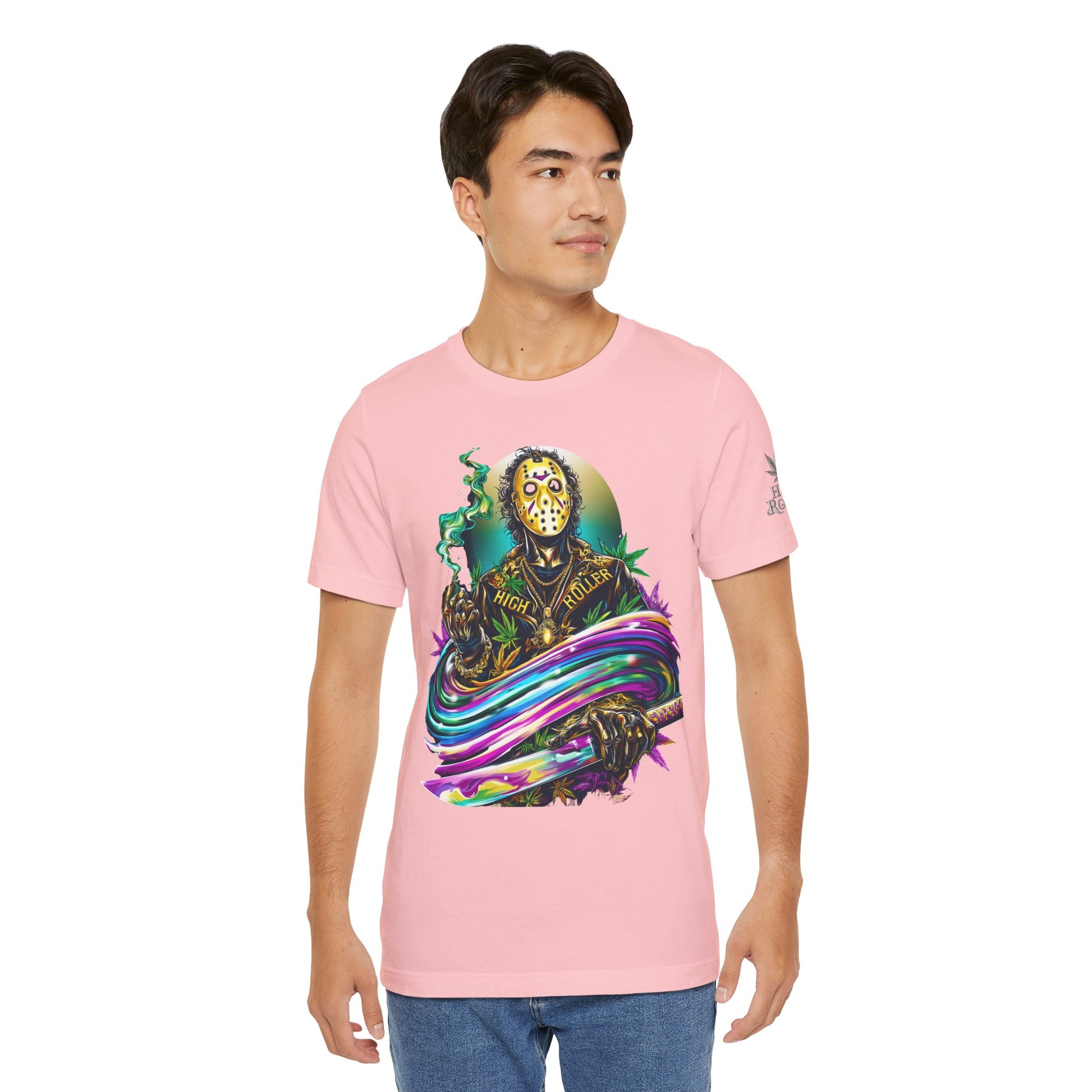 This rainbow-wielding Jason represents the HIGH ROLLER who fearlessly combines horror iconography with psychedelic cannabis culture, understanding that sometimes the most terrifying thing is how good life can be when you're properly elevated with premium flower and killer fashion. The design speaks to sophisticated thrill-seekers who appreciate that even immortal killers can evolve into brand ambassadors for the higher consciousness movement, proving that HIGH ROLLER philosophy extends to those brave enough to wear orange and wield rainbow weapons. By wearing this piece, you're declaring yourself unafraid of color, horror, or consciousness expansion, transforming Jason from nightmare fuel into a psychedelic prophet who proves that the real Camp Crystal Lake experience involves camping under the stars with premium cannabis and friends who appreciate both horror and haute couture.