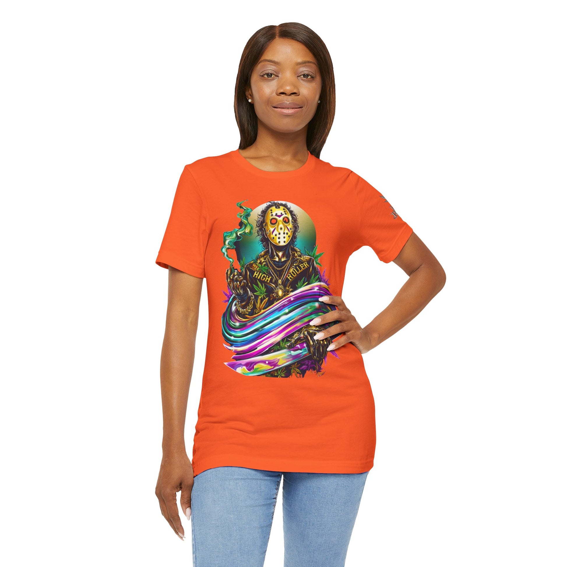Constructed from ultra-premium Bella+Canvas Airlume combed and ring-spun cotton in vibrant orange, this shirt delivers killer comfort with a bold colorway that ensures you'll never blend into the background at any gathering, with a fabric weight that provides perfect coverage while maintaining breathability for festival adventures and legendary smoke sessions. The advanced DTG printing technology makes every psychedelic detail explode with retina-searing intensity against the orange backdrop, from Jason's weathered hockey mask to the hypnotic rainbow swoosh that seems to pulse with otherworldly energy. The contemporary unisex fit with side-seamed construction creates a flattering silhouette that works equally well at horror conventions or underground raves, while the tear-away label ensures nothing disturbs your transformation into the ultimate psychedelic horror HIGH ROLLER.