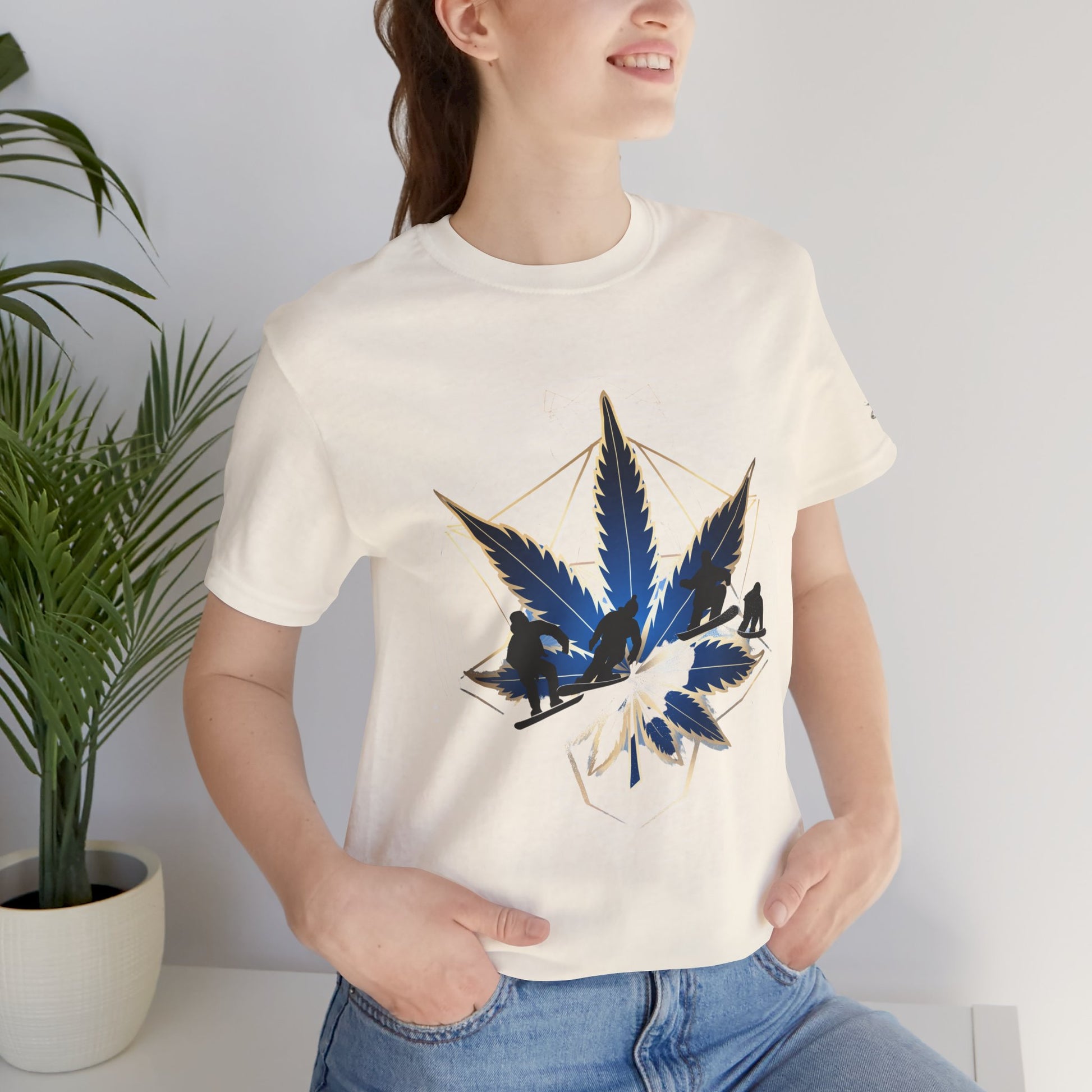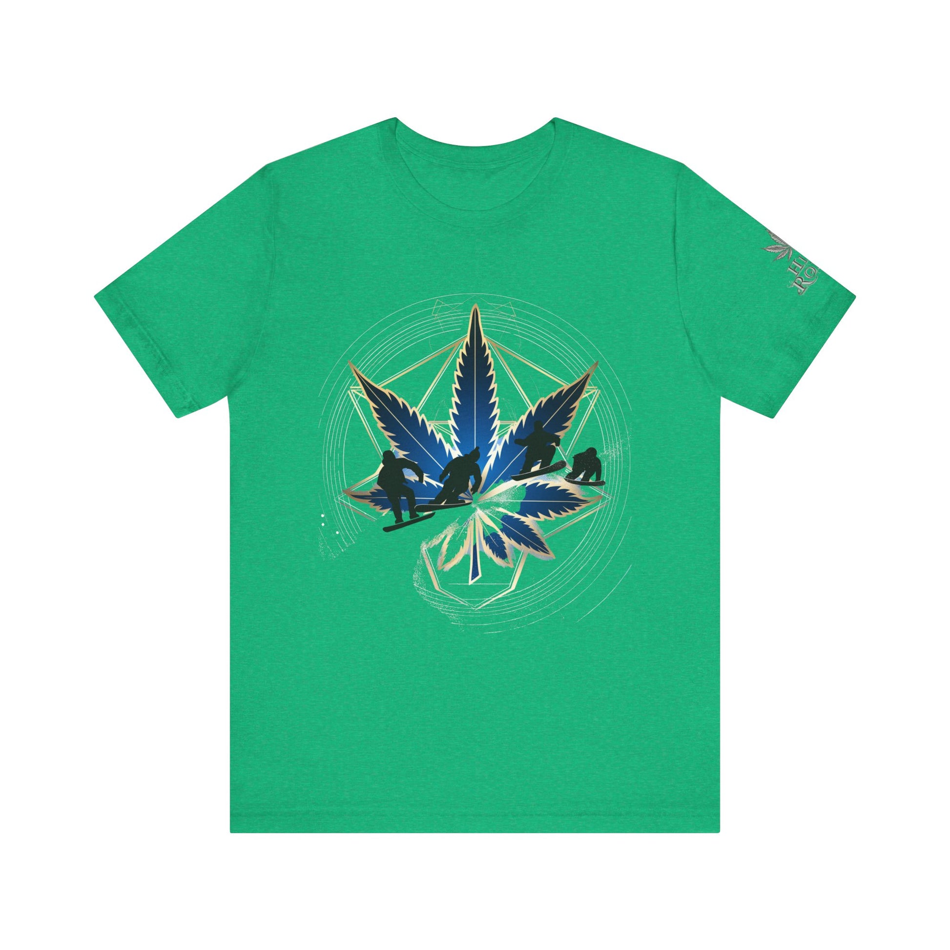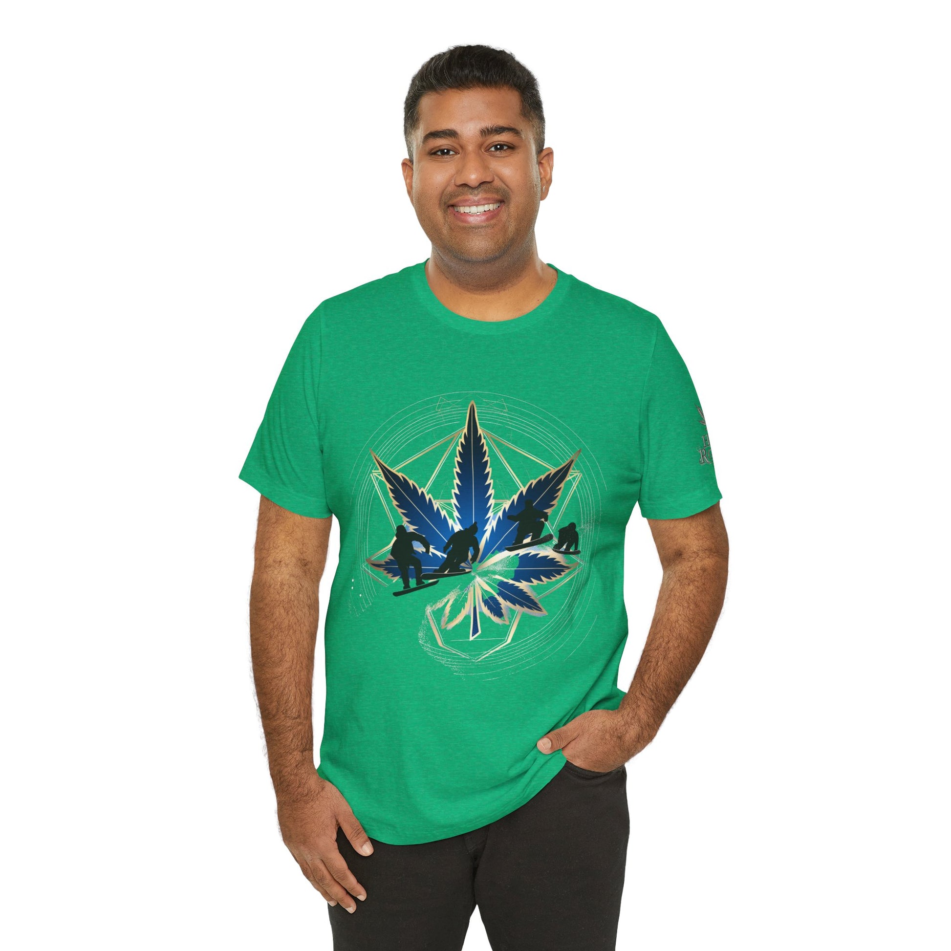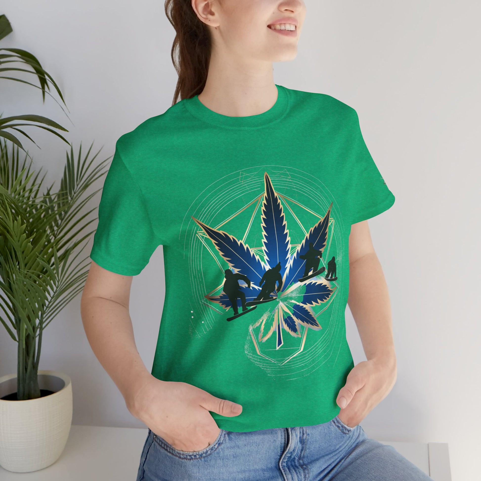 Engineered on premium Bella+Canvas Airlume combed and ring-spun cotton in vibrant emerald green, this tee delivers exceptional comfort for both active pursuits and casual wear. The retail-fit construction with side seams ensures the garment maintains its sophisticated silhouette whether you're hitting the slopes or the streets, while the tear-away label provides irritation-free comfort under snowboard gear or worn solo. Advanced direct-to-garment printing technology on colored fabric creates stunning contrast—the navy blue leaf and snowboarder maintain rich saturation, the metallic gold geometric lines shimmer with dimensional quality, and the mountain landscape details preserve crisp definition. The sacred geometry patterns print with mathematical precision while the dynamic snowboarder adds action sports authenticity. The fabric weight delivers substantial quality that supports detailed artwork while maintaining breathability. Available in sizes XS through 5XL, this unisex design welcomes all body types into the celebration of cannabis culture's deep roots in snowboarding, skiing, mountain sports, and outdoor adventure communities where cannabis has long been part of après-ski culture and mountain lifestyle.