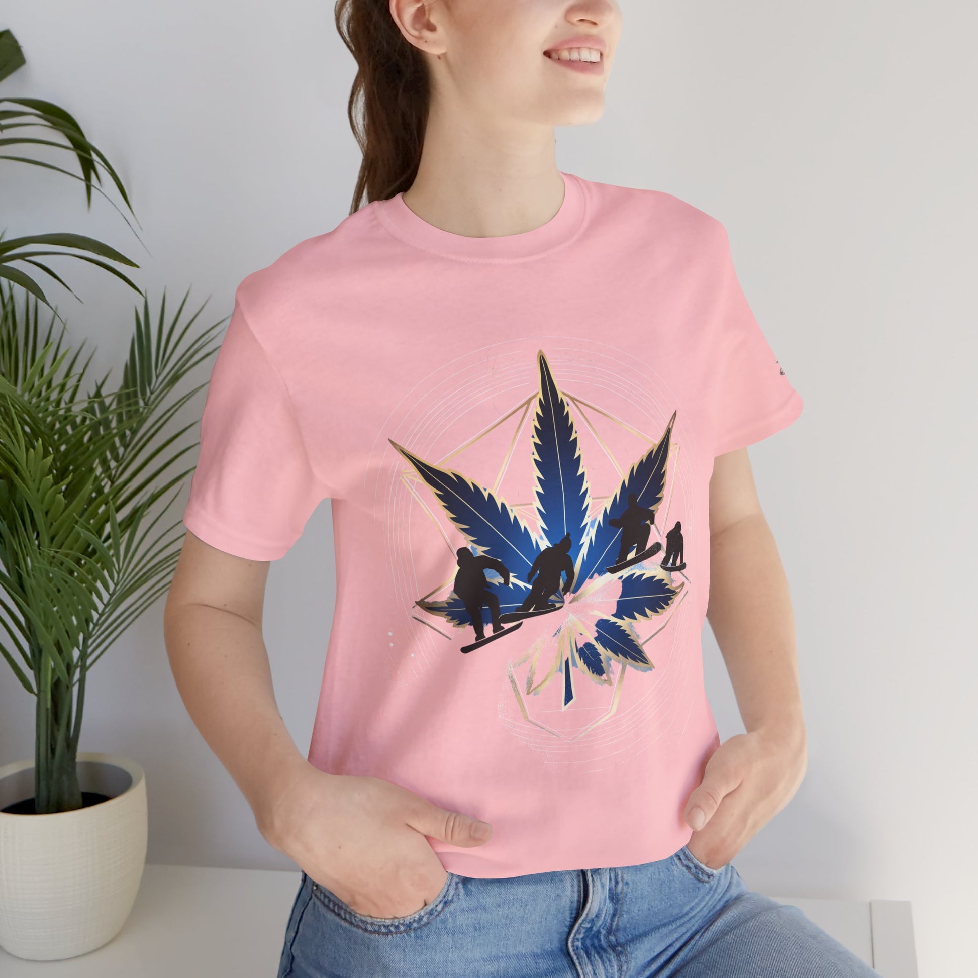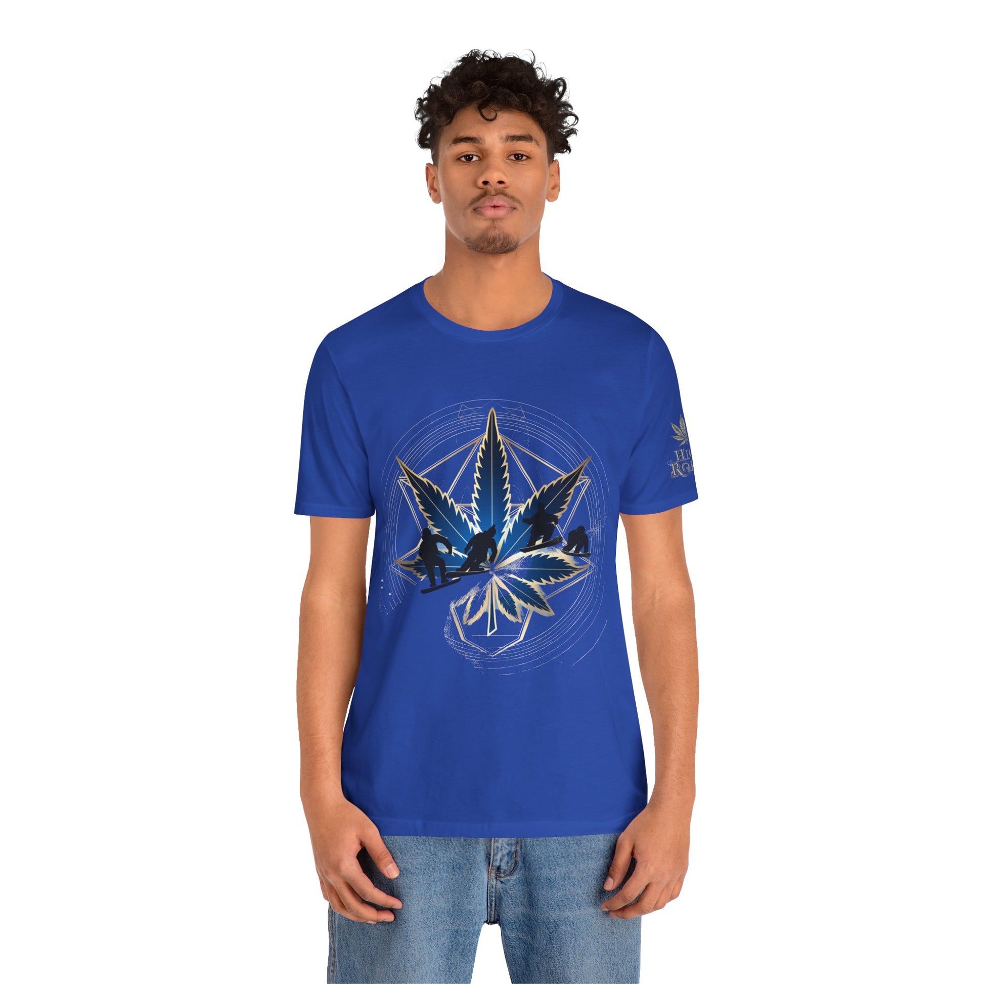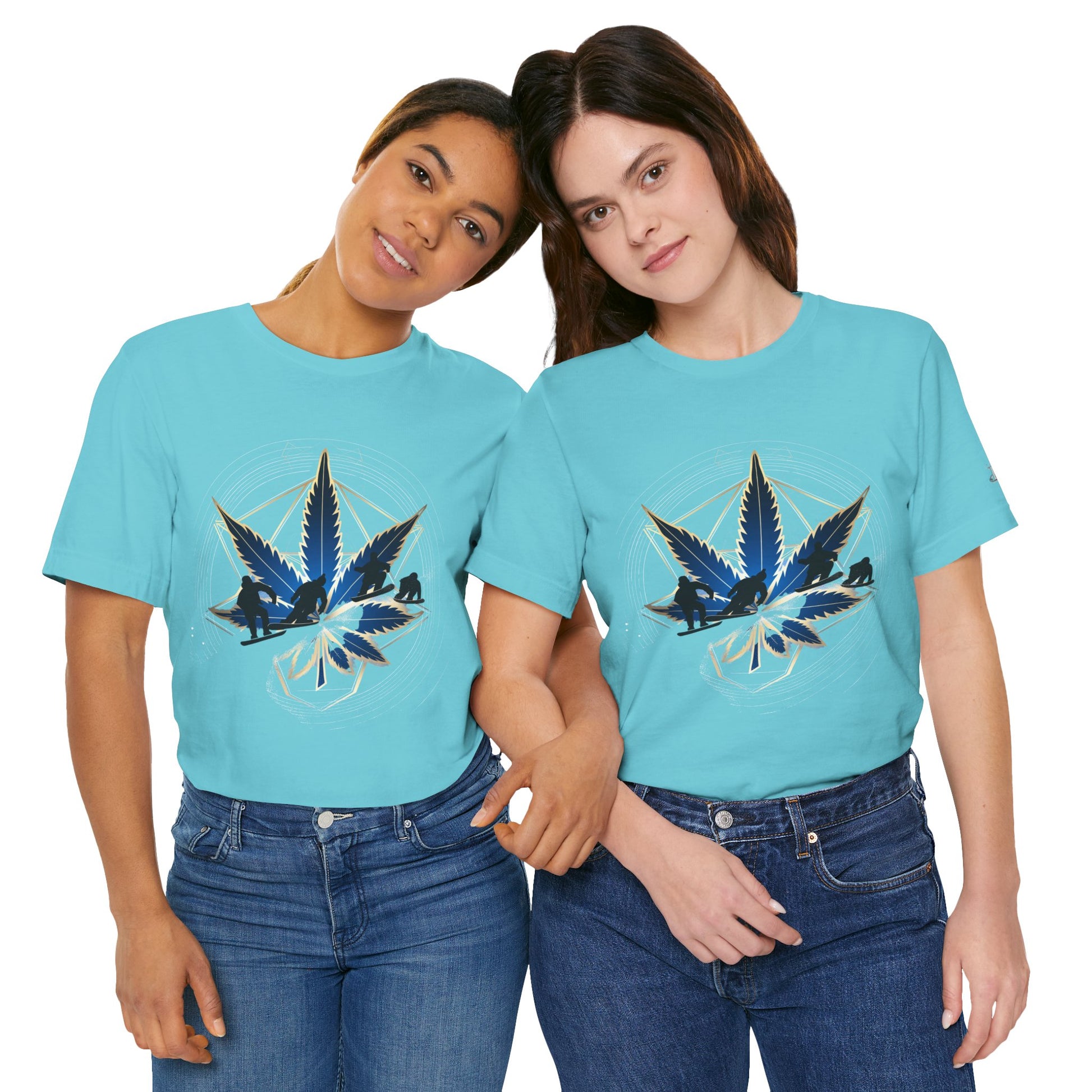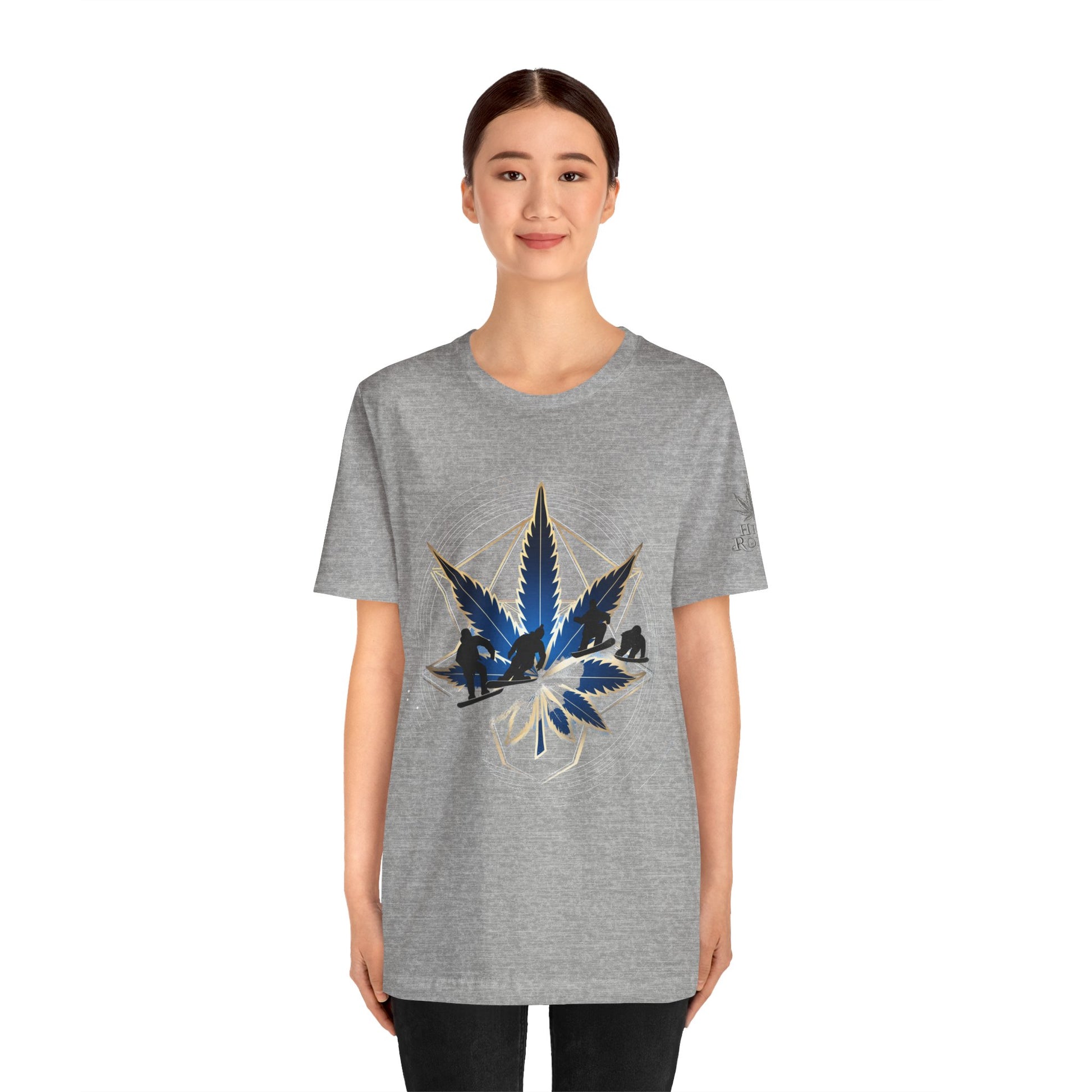 Engineered on premium Bella+Canvas Airlume combed and ring-spun cotton in vibrant emerald green, this tee delivers exceptional comfort for both active pursuits and casual wear. The retail-fit construction with side seams ensures the garment maintains its sophisticated silhouette whether you're hitting the slopes or the streets, while the tear-away label provides irritation-free comfort under snowboard gear or worn solo. Advanced direct-to-garment printing technology on colored fabric creates stunning contrast—the navy blue leaf and snowboarder maintain rich saturation, the metallic gold geometric lines shimmer with dimensional quality, and the mountain landscape details preserve crisp definition. The sacred geometry patterns print with mathematical precision while the dynamic snowboarder adds action sports authenticity. The fabric weight delivers substantial quality that supports detailed artwork while maintaining breathability. Available in sizes XS through 5XL, this unisex design welcomes all body types into the celebration of cannabis culture's deep roots in snowboarding, skiing, mountain sports, and outdoor adventure communities where cannabis has long been part of après-ski culture and mountain lifestyle.