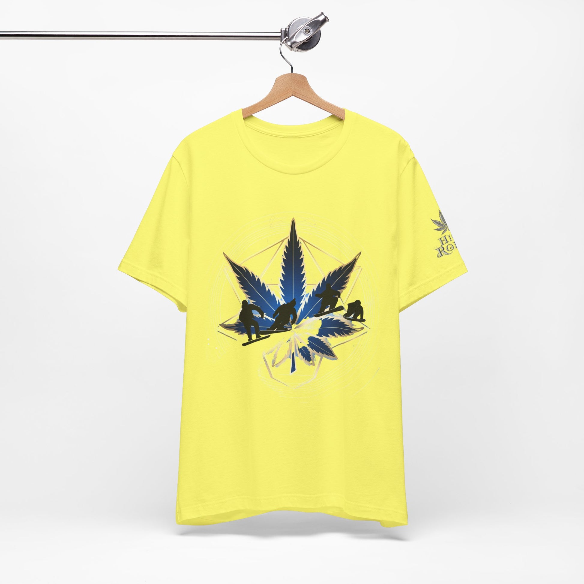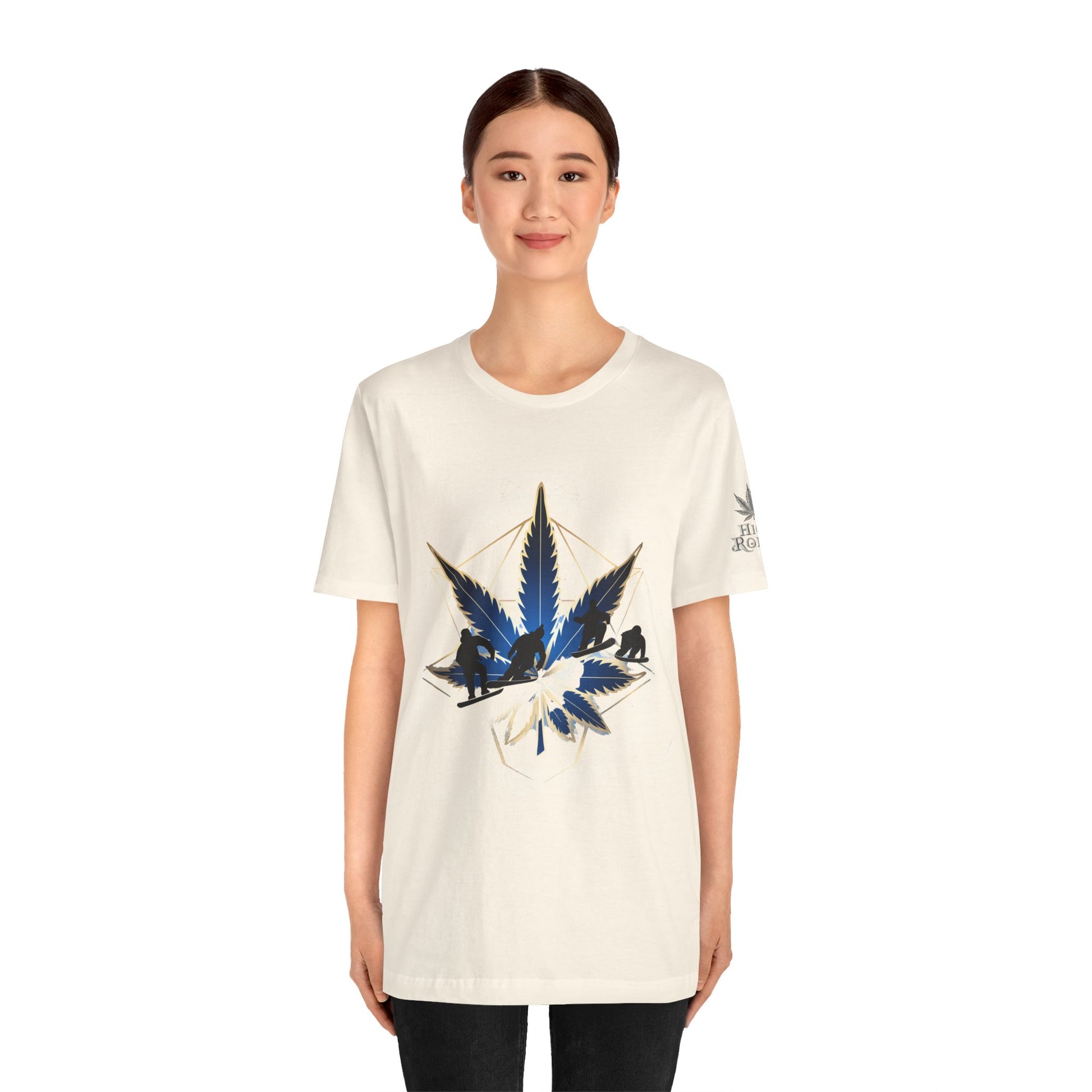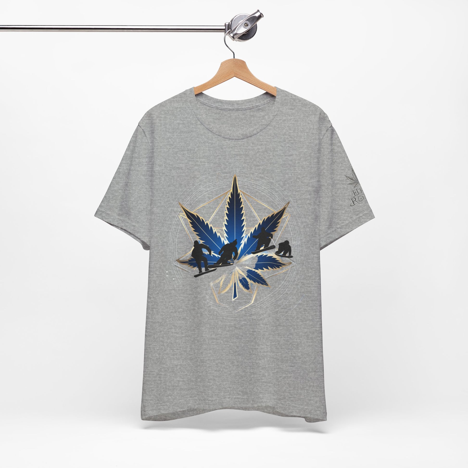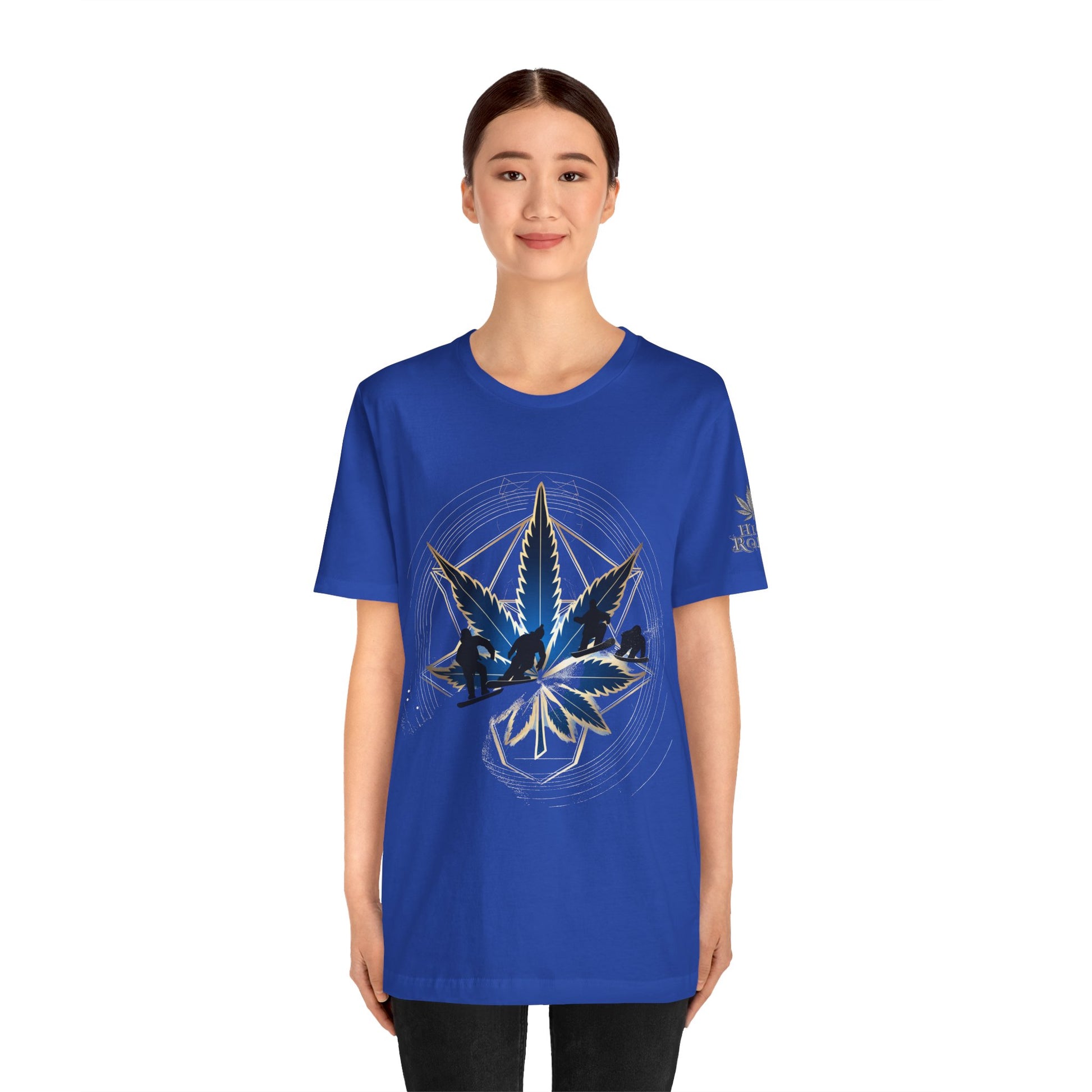 Engineered on premium Bella+Canvas Airlume combed and ring-spun cotton in vibrant emerald green, this tee delivers exceptional comfort for both active pursuits and casual wear. The retail-fit construction with side seams ensures the garment maintains its sophisticated silhouette whether you're hitting the slopes or the streets, while the tear-away label provides irritation-free comfort under snowboard gear or worn solo. Advanced direct-to-garment printing technology on colored fabric creates stunning contrast—the navy blue leaf and snowboarder maintain rich saturation, the metallic gold geometric lines shimmer with dimensional quality, and the mountain landscape details preserve crisp definition. The sacred geometry patterns print with mathematical precision while the dynamic snowboarder adds action sports authenticity. The fabric weight delivers substantial quality that supports detailed artwork while maintaining breathability. Available in sizes XS through 5XL, this unisex design welcomes all body types into the celebration of cannabis culture's deep roots in snowboarding, skiing, mountain sports, and outdoor adventure communities where cannabis has long been part of après-ski culture and mountain lifestyle.