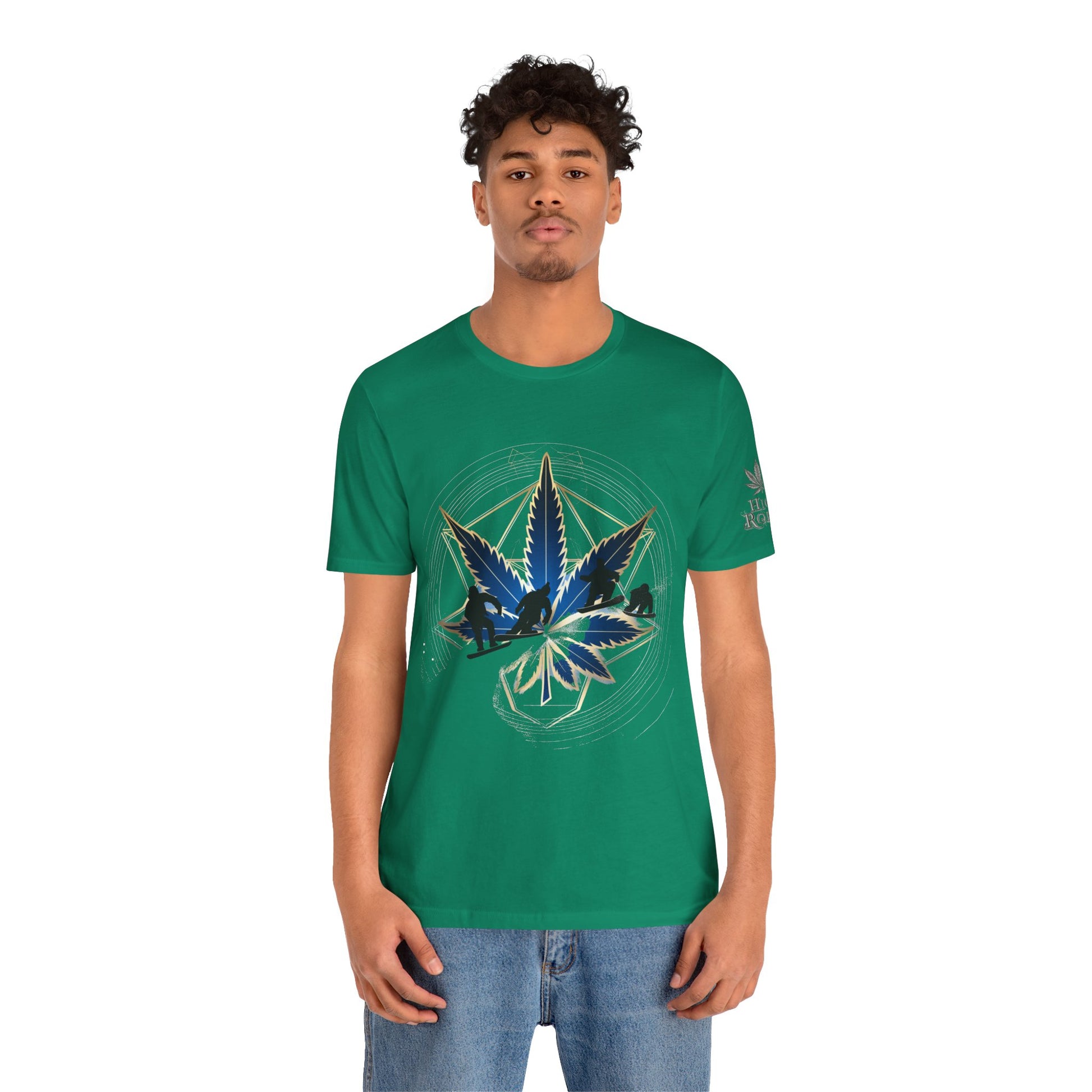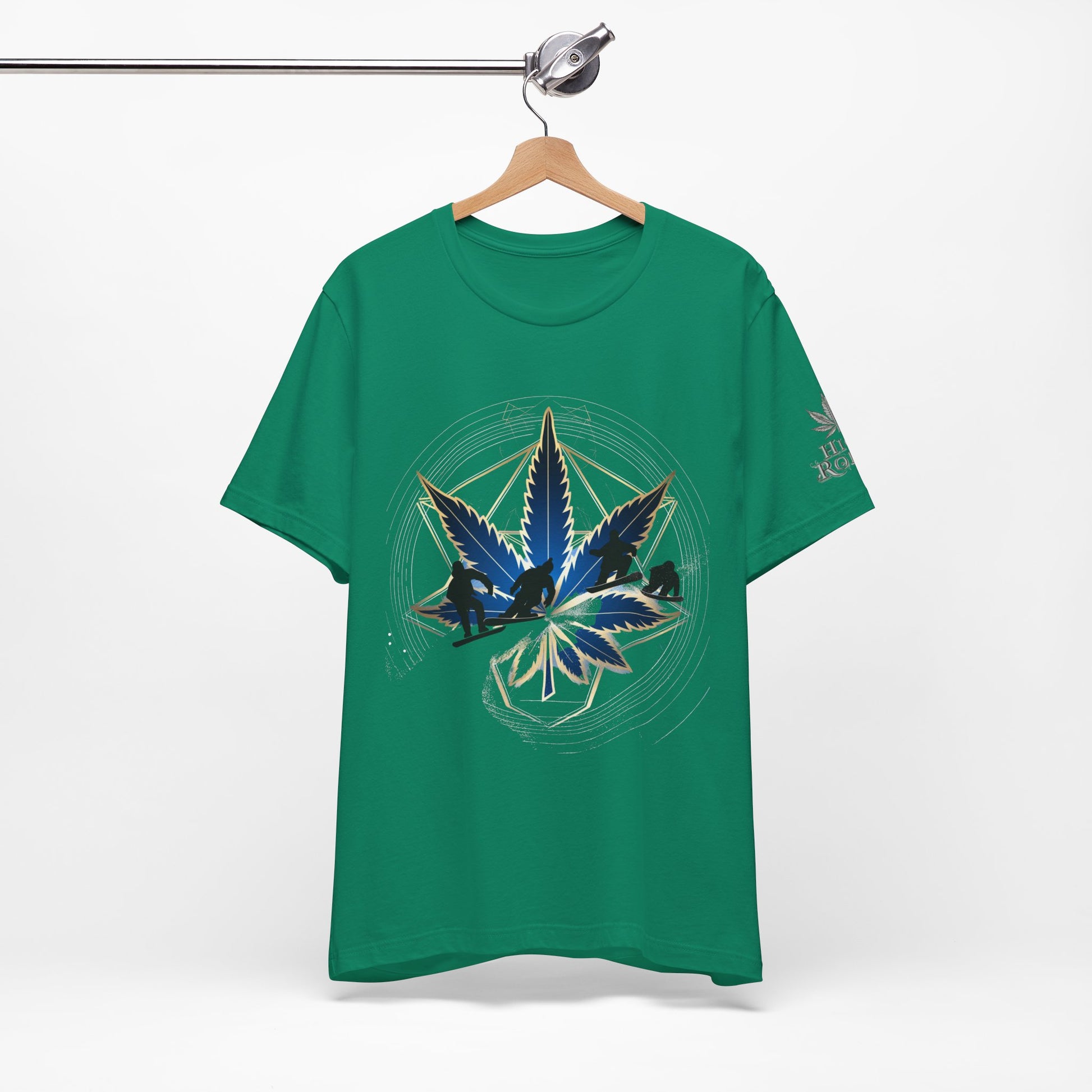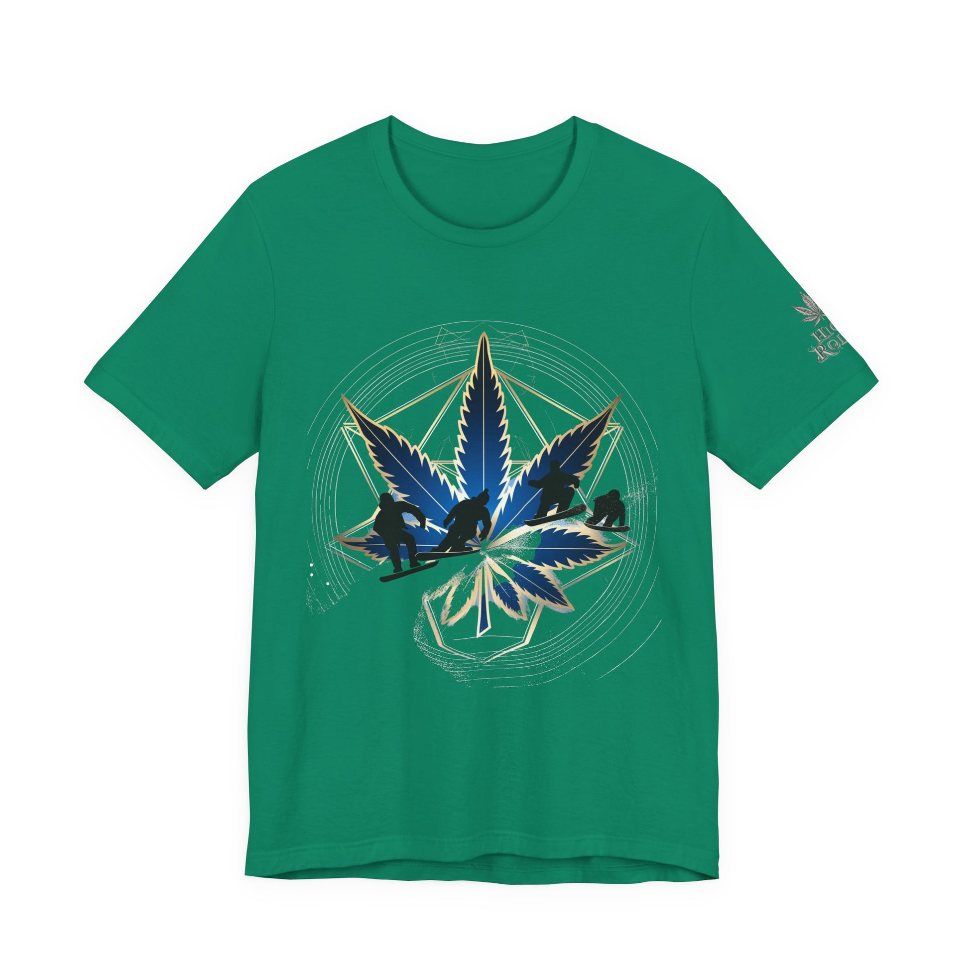 This dynamic design celebrates cannabis culture through the intersection of extreme sports and sacred geometry, featuring a stunning cannabis leaf rendered in deep navy blue and metallic gold tones with an integrated snowboarder catching air at the center. The leaf appears to have dimensional depth with a glossy, crystalline quality while the action sports figure performs a trick within the leaf structure, merging cannabis culture with snowboarding, mountain sports, and outdoor adventure lifestyle. Radiating outward from the central leaf are precise geometric lines forming a sacred geometry pattern—creating a hexagonal framework with subtle metallic gold accents that shimmer against the rich emerald green background. The mandala structure includes circular ripple effects suggesting energy and movement. Mountainous landscape silhouettes in dark navy appear within the lower leaf segments, perfectly complementing the snowboarding theme and connecting cannabis to alpine environments, winter sports culture, and outdoor adventure. The composition balances clean geometric precision with dynamic action sports energy, positioning cannabis as integral to mountain lifestyle and extreme sports communities. The premium emerald green fabric makes a bold cannabis-positive statement. The subtle "HIGH ROLLER" sleeve logo marks this as premium lifestyle apparel for those who appreciate cannabis as part of action sports, mountain culture, and outdoor adventure.