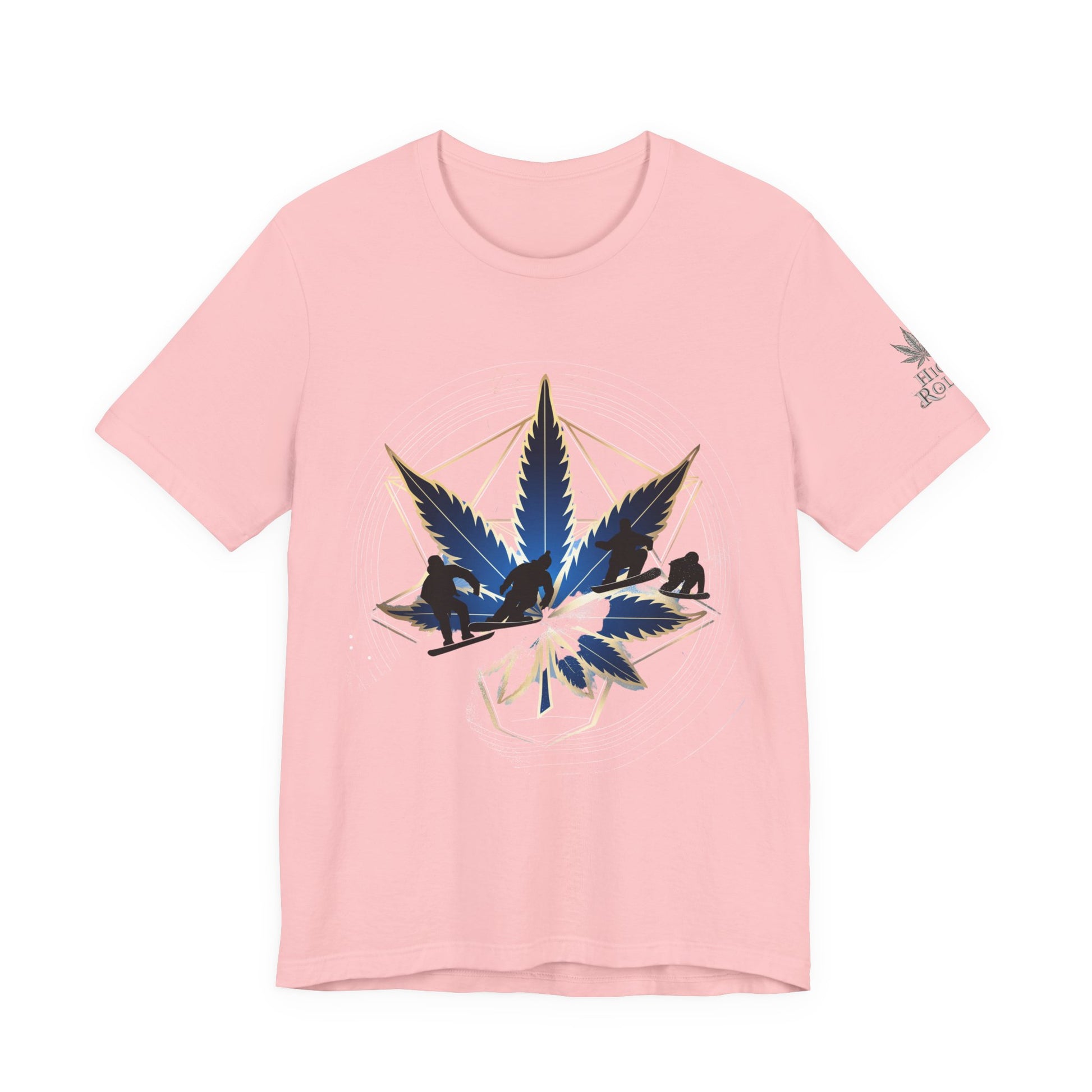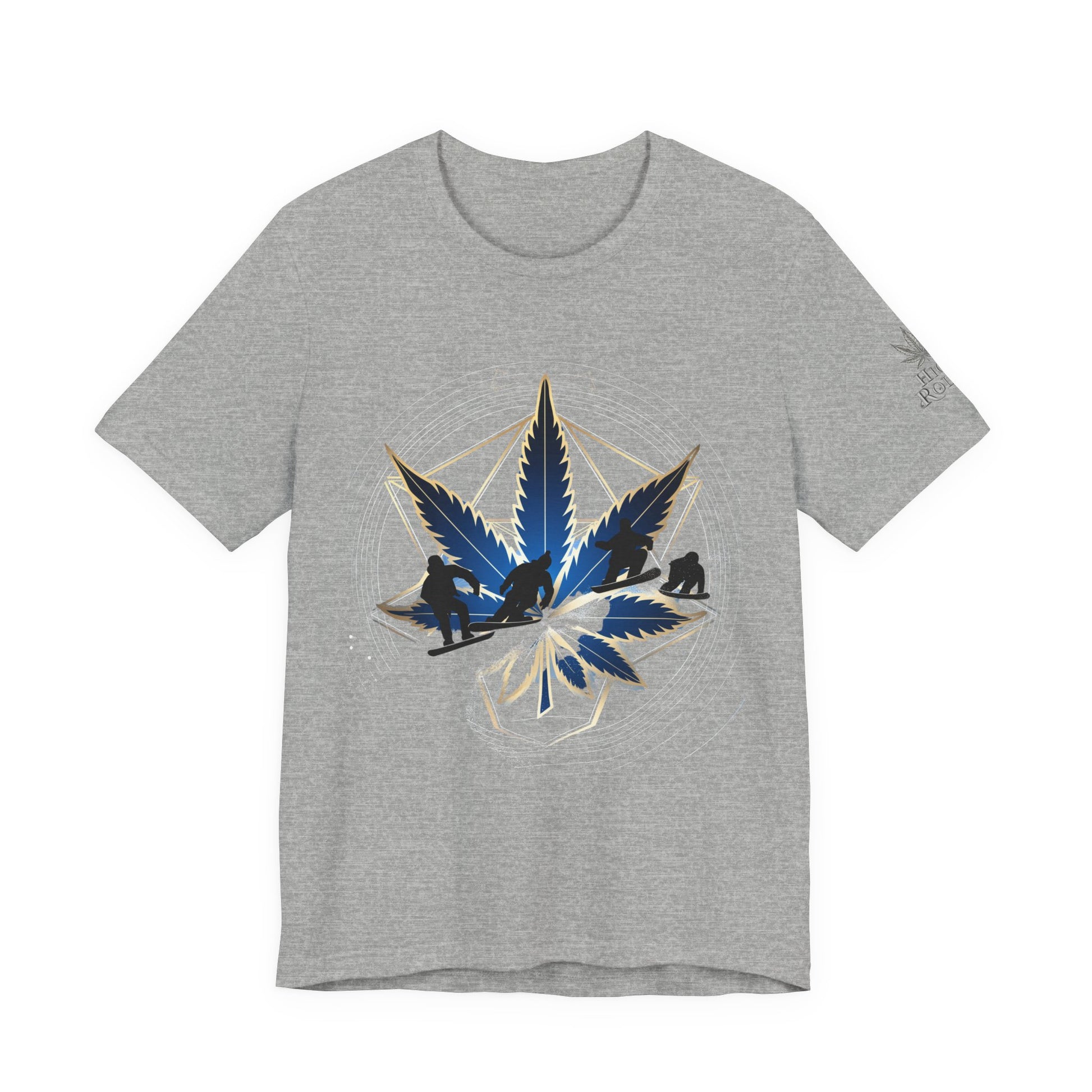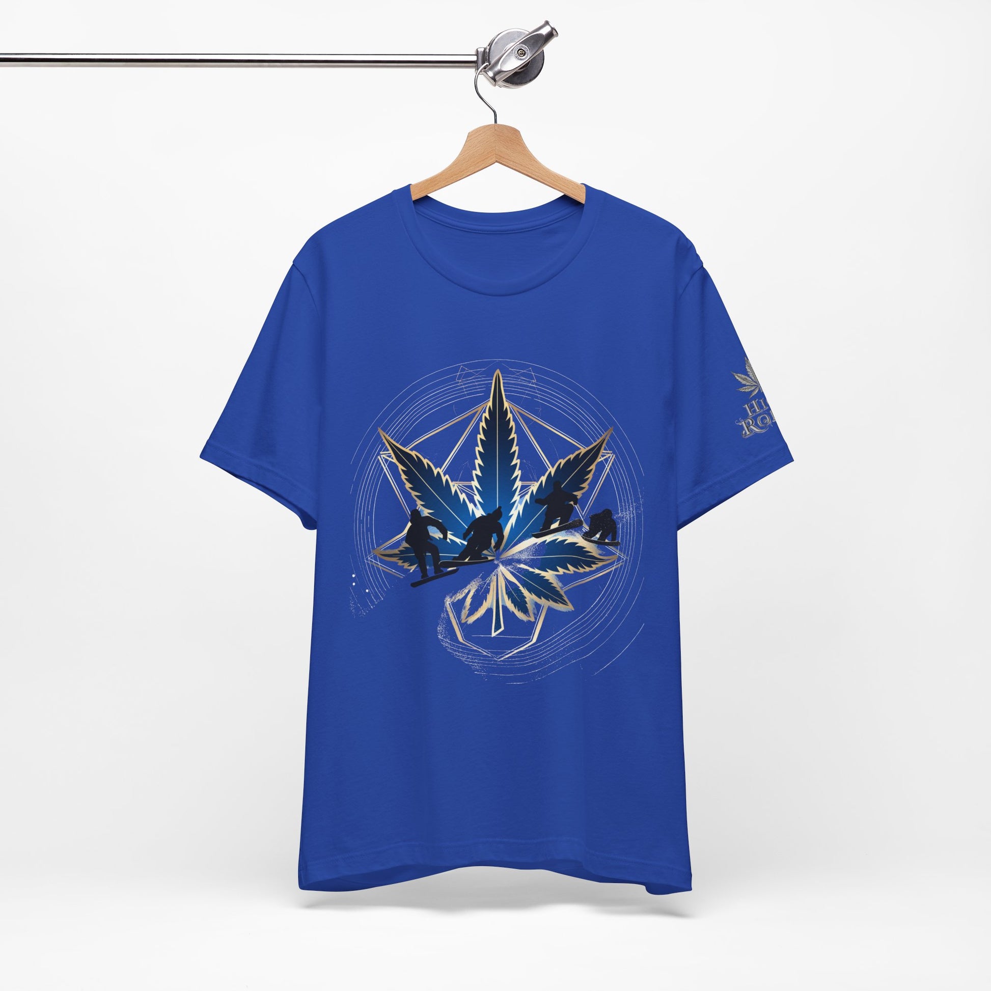 This dynamic design celebrates cannabis culture through the intersection of extreme sports and sacred geometry, featuring a stunning cannabis leaf rendered in deep navy blue and metallic gold tones with an integrated snowboarder catching air at the center. The leaf appears to have dimensional depth with a glossy, crystalline quality while the action sports figure performs a trick within the leaf structure, merging cannabis culture with snowboarding, mountain sports, and outdoor adventure lifestyle. Radiating outward from the central leaf are precise geometric lines forming a sacred geometry pattern—creating a hexagonal framework with subtle metallic gold accents that shimmer against the rich emerald green background. The mandala structure includes circular ripple effects suggesting energy and movement. Mountainous landscape silhouettes in dark navy appear within the lower leaf segments, perfectly complementing the snowboarding theme and connecting cannabis to alpine environments, winter sports culture, and outdoor adventure. The composition balances clean geometric precision with dynamic action sports energy, positioning cannabis as integral to mountain lifestyle and extreme sports communities. The premium emerald green fabric makes a bold cannabis-positive statement. The subtle "HIGH ROLLER" sleeve logo marks this as premium lifestyle apparel for those who appreciate cannabis as part of action sports, mountain culture, and outdoor adventure.
